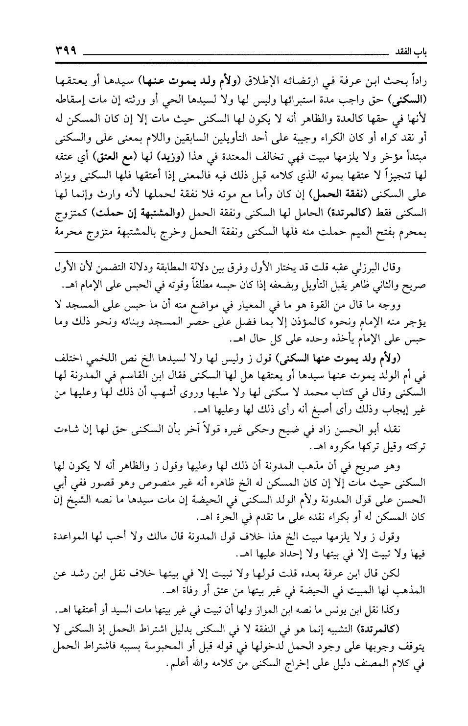رادًّا بحث ابن عرفة في ارتضائه الإطلاق (ولأم ولد يموت عنها) سيدها أو يعتقها (السكنى) حق واجب مدة استبرائها وليس لها ولا لسيدها الحي أو ورثته إن مات إسقاطه لأنها في حقها كالعدة والظاهر أنه لا يكون لها السكنى حيث مات إلا إن كان المسكن له أو نقد كراه أو كان الكراء وجيبة على أحد التأويلين السابقين واللام بمعنى على والسكنى مبتدأ مؤخر ولا يلزمها مبيت فهي تخالف المعتدة في هذا (وزيد) لها (مع العتق) أي عتقه لها تنجيزًا لا عتقها بموته الذي كلامه قبل ذلك فيه فالمعنى إذا أعتقها فلها السكنى ويزاد على السكنى (نفقة الحمل) إن كان وأما مع موته فلا نفقة لحملها لأنه وارث وإنما لها السكنى فقط (كالمرتدة) الحامل لها السكنى ونفقة الحمل (والمشتبهة إن حملت) كمتزوج بمحرم بفتح الميم حملت منه فلها السكنى ونفقة الحمل وخرج بالمشتبهة متزوج محرمة