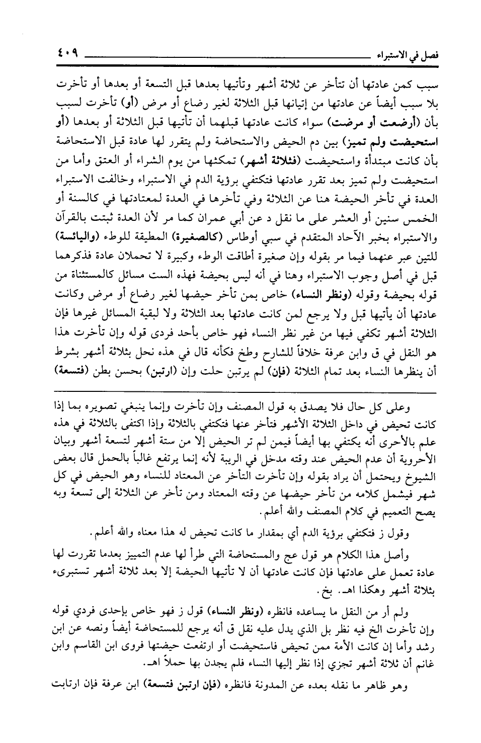 سبب كمن عادتها أن تتأخر عن ثلاثة أشهر وتأتيها بعدها قبل التسعة أو بعدها أو تأخرت بلا سبب أيضًا عن عادتها من إتيانها قبل الثلاثة لغير رضاع أو مرض (أو) تأخرت لسبب بأن (أرضعت أو مرضت) سواء كانت عادتها قبلهما أن تأتيها قبل الثلاثة أو بعدها (أو استحيضت ولم تميز) بين دم الحيض والاستحاضة ولم يتقرر لها عادة قبل الاستحاضة بأن كانت مبتدأة واستحيضت (فثلاثة أشهر) تمكثها من يوم الشراء أو العتق وأما من استحيضت ولم تميز بعد تقرر عادتها فتكتفي برؤية الدم في الاستبراء وخالفت الاستبراء العدة في تأخر الحيضة هنا عن الثلاثة وفي تأخرها في العدة لمعتادتها في كالسنة أو الخمس سنين أو العشر على ما نقل د عن أبي عمران كما مر لأن العدة ثبتت بالقرآن والاستبراء بخبر الآحاد المتقدم في سبي أوطاس (كالصغيرة) المطيقة للوطء (واليائسة) للتين عبر عنهما فيما مر بقوله وإن صغيرة أطاقت الوطء وكبيرة لا تحملان عادة فذكرهما قبل في أصل وجوب الاستبراء وهنا في أنه ليس بحيضة فهذه الست مسائل كالمستثناة من قوله بحيضة وقوله (ونظر النساء) خاص بمن تأخر حيضها لغير رضاع أو مرض وكانت عادتها أن يأتيها قبل ولا يرجع لمن كانت عادتها بعد الثلاثة ولا لبقية المسائل غيرها فإن الثلاثة أشهر تكفي فيها من غير نظر النساء فهو خاص بأحد فردى قوله وإن تأخرت هذا هو النقل في ق وابن عرفة خلافًا للشارح وطخ فكأنه قال في هذه نحل بثلاثة أشهر بشرط أن ينظرها النساء بعد تمام الثلاثة (فإن) لم يرتبن حلت وإن (ارتبن) بحسن بطن (فتسعة)