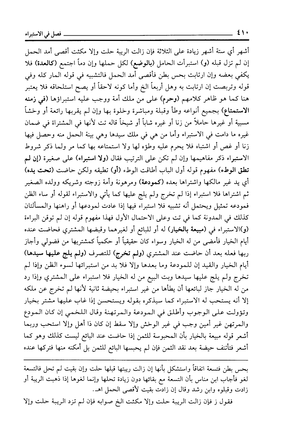 أشهر أي ستة أشهر زيادة على الثلاثة فإن زالت الريبة حلت وإلا مكثت أقصى أمد الحمل إن لم تزل قبله (و) استبرأت الحامل (بالوضع) لكل حملها وإن دمًا اجتمع (كالعدة) فلا يكفي بعضه وإن ارتابت بحس بطن فأقصى أمد الحمل فالتشبيه في قوله المار كله وفي قوله وتربصت إن ارتابت به وهل أربعًا الخ وأما كونه لاحقًا أو يصح استلحاقه فلا يعتبر هنا كما هو ظاهر كلامهم (وحرم) على من ملك أمة ووجب عليه استبراؤها (في زمنه الاستمتاع) بجميع أنواعه وطأ وقبلة ومباشرة وخلوة بها وإن لم يقربها رائعة أو وخشًا مسبية أو غيرها حاملًا من زنا أو غيره شابًّا أو شيخًا قاله تت لأنها في المشتراة في ضمان غيره ما دامت في الاستبراء وأما من هي في ملك سيدها وهي بينة الحمل منه وحصل فيها زنا أو غص أو اشتباه فلا يحرم عليه وطؤه لها ولا استمتاعه بها كما مر ولما ذكر شروط الاستبراء ذكر مفاهيمها وإن لم تكن على الترتيب فقال (ولا استبراء) على صغيرة (إن لم تطق الوطء) مفهوم قوله أول الباب أطاقت الوطء (أو) تطيقه ولكن حاضت (تحت يده) أي يد غير مالكها واشتراها بعده (كمودعة) ومرهونة وأمة زوجته وشريكه وولده الصغير ثم اشتراها فلا استبراء إذا لم تخرج ولم يلج عليها كما يأتي والاستبراء لقوله أو ساء الظن فمودعه تمثيل ويحتمل أنه تشبيه فلا استبراء فيها إذا عادت لمودعها أو راهنها والمسألتان كذلك في المدونة كما في تت وعلى الاحتمال الأول فهذا مفهوم قوله إن لم توقن البراءة (و) الاستبراء في (مبيعة بالخيار) له أو للبائع أو لغيرهما وقبضها المشتري فحاضت عنده أيام الخيار فأمضى من له الخيار وسواء كان حقيقيًّا أو حكميًّا كمشتريها من فضولي وأجاز ربها فعله بعد أن حاضت عند المشتري (ولم تخرج) للتصرف (ولم يلج عليها سيدها) أيام الخيار والقيد إن للمودعة وما بعدها وإلا فلا بد من استبرائها لسوء الظن وإذا لم تخرج ولم يلج عليها سيدها وبت البيع من له الخيار فلا استبراء على المشتري وإذا رد من له الخيار جاز لبائعها أن يطأها من غير استبراء بحيضة ثانية لأنها لم تخرج عن ملكه إلا أنه يستحب له الاستبراء كما سيذكره بقوله ويستحسن إذا غاب عليها مشتر بخيار وتؤولت على الوجوب وأطلق في المودعة والمرتهنة وقال اللخمي إن كان المودع والمرتهن غير أمين وجب في غير الوخش وإلا سقط إن كان ذا أهل وإلا استحب وربما أشعر قوله مبيعة بالخيار بأن المحبوسة للثمن إذا حاضت عند البائع ليست كذلك وهو كما أشعر فتأتنف حيضة بعد نقد الثمن فإن لم يحبسها البائع للثمن بل أمكنه منها فتركها عنده