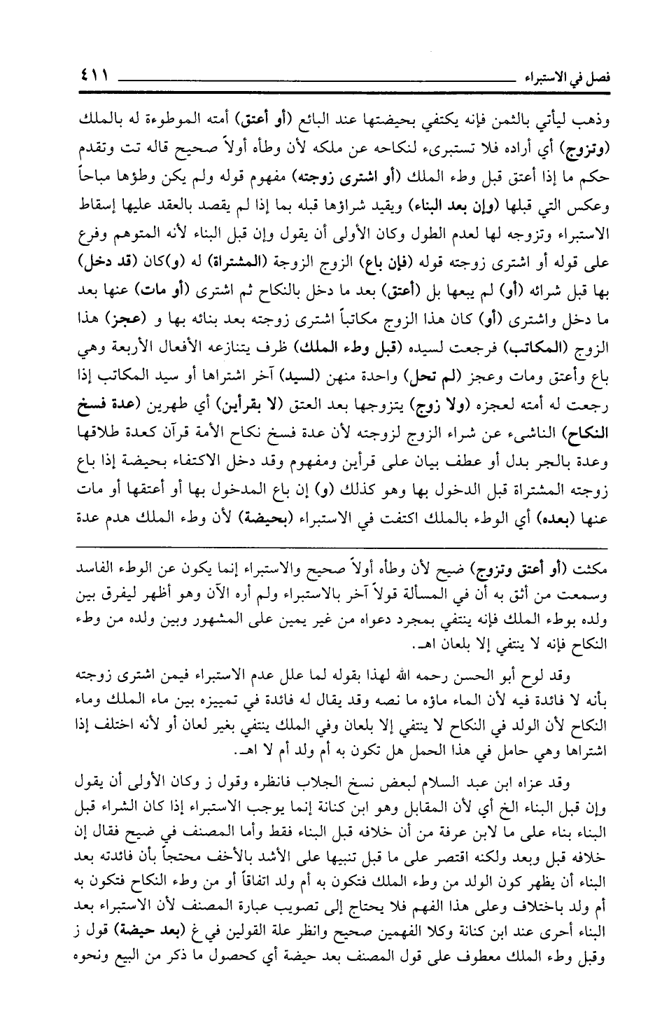 مكثت (أو أعتق وتزوج) ضيح لأن وطأه أولًا صحيح والاستبراء إنما يكون عن الوطء الفاسد وسمعت من أثق به أن في المسألة قولًا آخر بالاستبراء ولم أره الآن وهو أظهر ليفرق بين ولده بوطء الملك فإنه ينتفي بمجرد دعواه من غير يمين على المشهور وبين ولده من وطء النكاح فإنه لا ينتفي إلا بلعان اهـ.