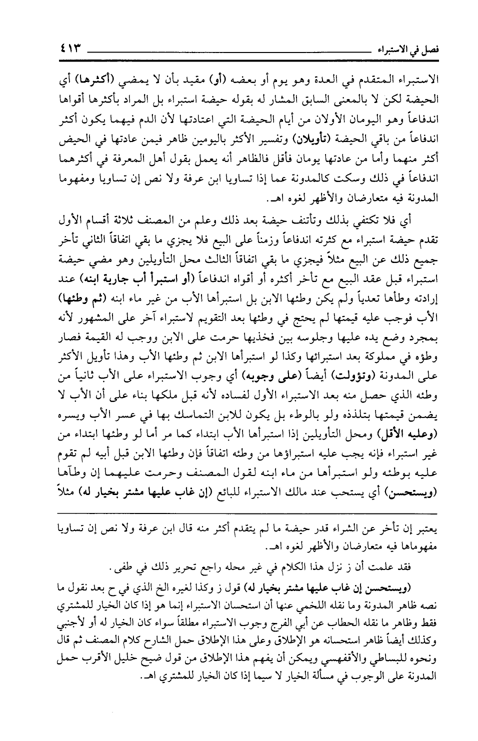 الاستبراء المتقدم في العدة وهو يوم أو بعضه (أو) مقيد بأن لا يمضي (أكثرها) أي الحيضة لكن لا بالمعنى السابق المشار له بقوله حيضة استبراء بل المراد بأكثرها أقواها اندفاعًا وهو اليومان الأولان من أيام الحيضة التي اعتادتها لأن الدم فيهما يكون أكثر اندفاعًا من باقي الحيضة (تأويلان) وتفسير الأكثر باليومين ظاهر فيمن عادتها في الحيض أكثر منهما وأما من عادتها يومان فأقل فالظاهر أنه يعمل بقول أهل المعرفة في أكثرهما اندفاعًا في ذلك وسكت كالمدونة عما إذا تساويا ابن عرفة ولا نص إن تساويا ومفهوما المدونة فيه متعارضان والأظهر لغوه اهـ.