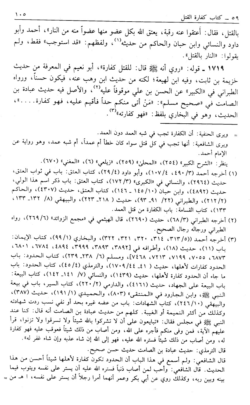 1719- قَوْلُهُ: "رُوِيَ أَنَّهُ صَلَّى اللَّهُ عَلَيْهِ وَسَلَّمَ قَالَ: "لِلْقَتْلِ كَفَّارَةٌ"، أَبُو نُعَيْمٍ فِي الْمَعْرِفَةِ مِنْ حَدِيثِ خُزَيْمَةَ بْنِ ثَابِتٍ، وَفِيهِ ابْنُ لَهِيعَةَ؛ لَكِنَّهُ مِنْ حَدِيثِ ابْنِ وَهْبٍ عَنْهُ، فَيَكُونُ حَسَنًا، وَرَوَاهُ الطَّبَرَانِيُّ فِي "الْكَبِيرِ" عَنْ الْحَسَنِ بْنِ عَلِيٍّ مَوْقُوفًا عَلَيْهِ2، وَالْأَصْلُ فِيهِ حَدِيثُ عُبَادَةَ بْنِ الصَّامِتِ فِي "صَحِيحِ مُسْلِمٍ": "مَنْ أَتَى مِنْكُمْ حَدًّا فَأُقِيمَ عَلَيْهِ، فَهُوَ كَفَّارَةٌ ... "، الْحَدِيثُ، وَهُوَ فِي الْبُخَارِيِّ بِلَفْظِ: "فَهُوَ كَفَّارَتُهُ" 3.