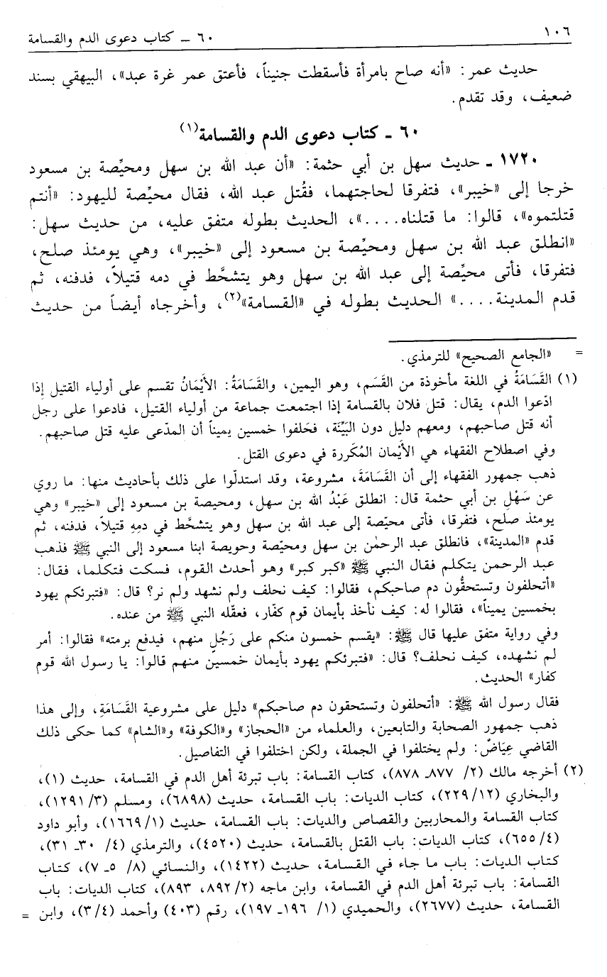 1720- حَدِيثُ سَهْلِ بْنِ أَبِي حَثْمَةَ: "أَنَّ عَبْدَ اللَّهِ بْنَ سَهْلٍ وَمُحَيِّصَةَ بْنَ مَسْعُودٍ خَرَجَا إلَى "خَيْبَرَ"، فَتَفَرَّقَا لِحَاجَتِهِمَا، فَقُتِلَ عَبْدُ اللَّهِ، فَقَالَ مُحَيِّصَةُ لِلْيَهُودِ: "أَنْتُمْ قَتَلْتُمُوهُ"، قَالُوا: مَا قَتَلْنَاهُ ... "، الْحَدِيثُ بِطُولِهِ مُتَّفَقٌ عَلَيْهِ، مِنْ حَدِيثِ سَهْلٍ: "انْطَلَقَ عَبْدُ اللَّهِ بْنُ سَهْلٍ وَمُحَيِّصَةُ بْنُ مَسْعُودٍ إلَى "خَيْبَرَ"، وَهِيَ يَوْمئِذٍ صُلْحٌ، فَتَفَرَّقَا، فَأَتَى مُحَيِّصَةُ إلَى عَبْدِ اللَّهِ بْنِ سَهْلٍ وَهُوَ يَتَشَحَّطُ فِي دَمِهِ قَتِيلًا، فَدَفَنَهُ ثُمَّ قَدِمَ الْمَدِينَةَ ... "، الْحَدِيثُ بِطُولِهِ فِي "الْقَسَامَةِ"2، وَأَخْرَجَاهُ أَيْضًا مِنْ حَدِيثِ
