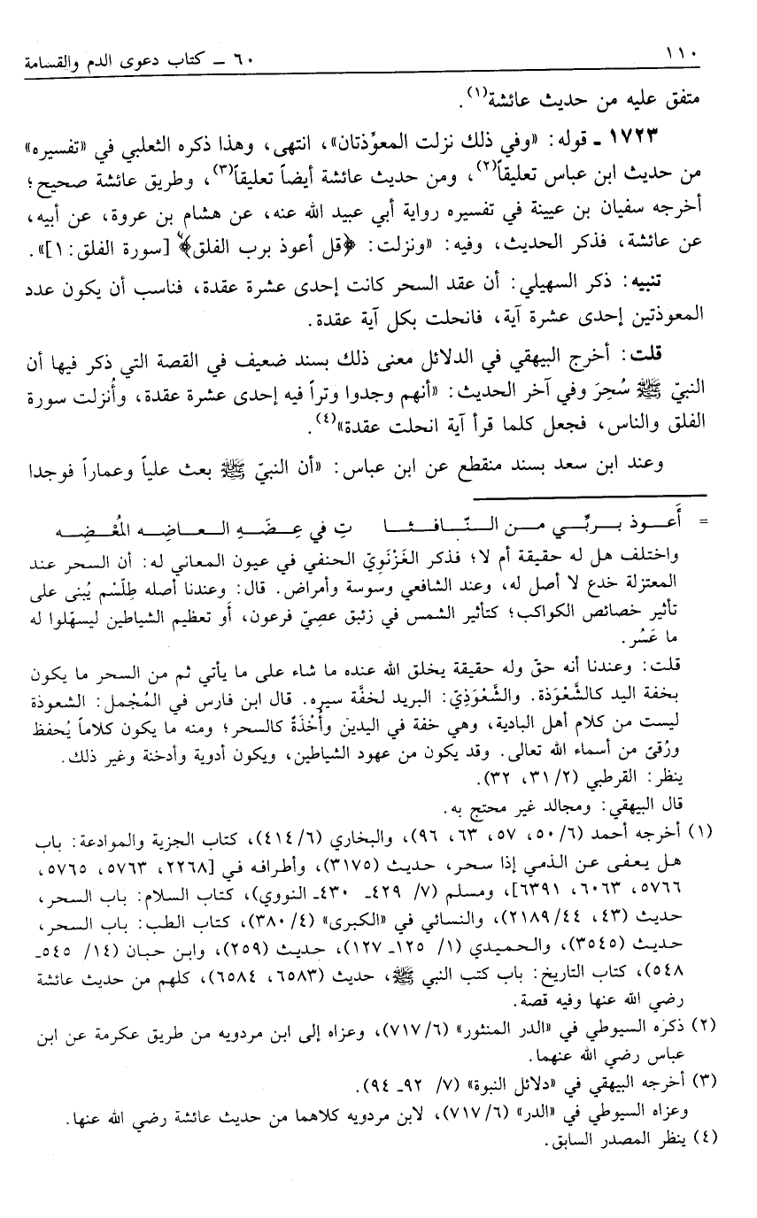 قُلْت: أَخْرَجَ الْبَيْهَقِيّ فِي الدَّلَائِلِ مَعْنَى ذَلِكَ بِسَنَدٍ ضَعِيفٍ فِي الْقِصَّةِ الَّتِي ذَكَرَ فيها أن النبي صَلَّى اللَّهُ عَلَيْهِ وَسَلَّمَ سحر وَفِي آخِرِ الْحَدِيثِ: "أَنَّهُمْ وَجَدُوا وِتْرًا فِيهِ إحْدَى عَشْرَةَ عُقْدَةً، وَأُنْزِلَتْ سُورَةُ الْفَلَقِ وَالنَّاسِ فَجَعَلَ كُلَّمَا قَرَأَ آيَةً انْحَلَّتْ عُقْدَةٌ" 4.