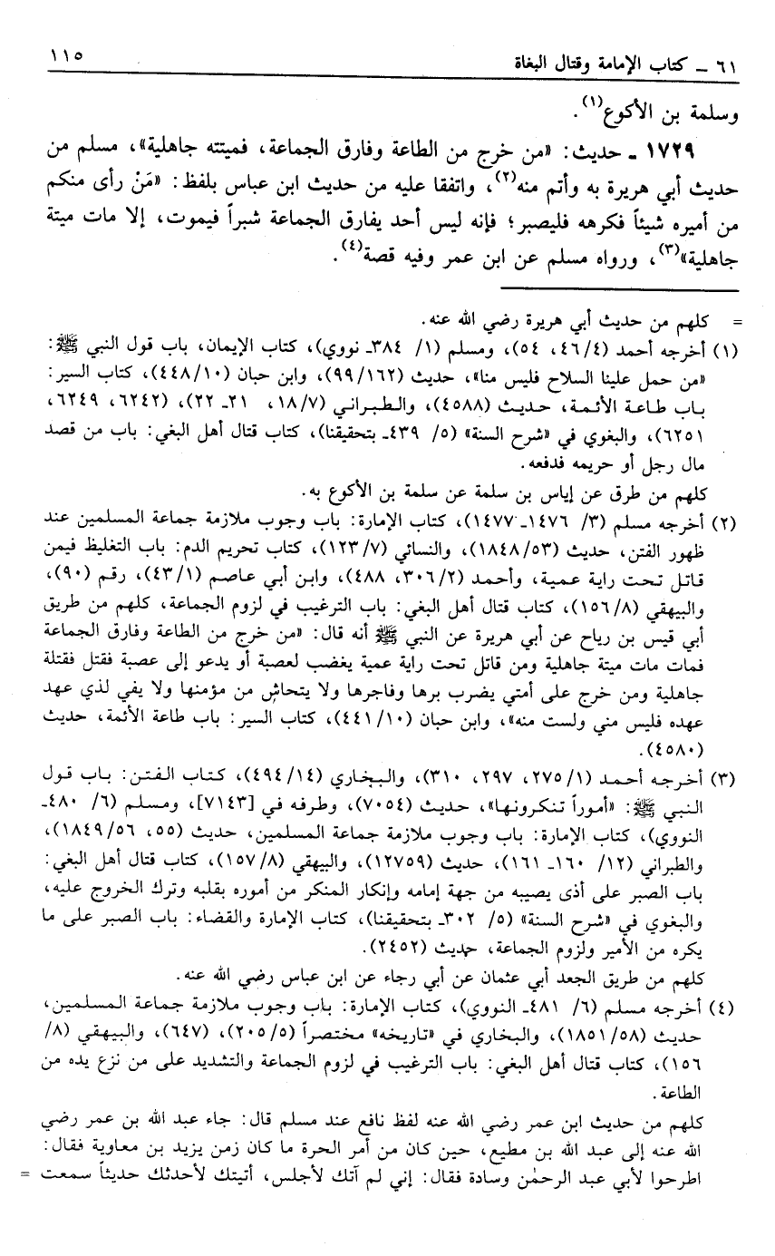 1729- حَدِيثُ: "مَنْ خَرَجَ مِنْ الطَّاعَةِ وَفَارَقَ الْجَمَاعَةَ، فَمِيتَةٌ جَاهِلِيَّةٌ"، مُسْلِمٌ مِنْ حَدِيثِ أَبِي هُرَيْرَةَ بِهِ وَأَتَمَّ مِنْهُ2، وَاتَّفَقَا عَلَيْهِ مِنْ حَدِيثِ ابْنِ عَبَّاسٍ بِلَفْظِ: "مَنْ رَأَى مِنْكُمْ مِنْ أَمِيرِهِ شَيْئًا فكرهه فَلْيَصْبِرْ؛ فَإِنَّهُ لَيْسَ أَحَدٌ يُفَارِقُ الْجَمَاعَةَ شِبْرًا فَيَمُوتُ، إلَّا مَاتَ مِيتَةً جَاهِلِيَّةً" 3، وَرَوَاهُ مُسْلِمٌ عَنْ ابْنِ عُمَرَ وَفِيهِ قِصَّةٌ4.