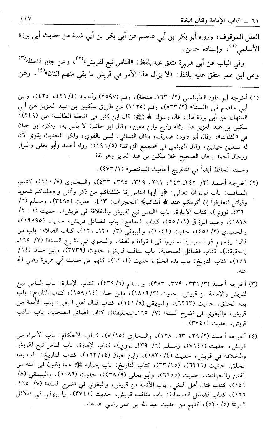 4 أخرجه أحمد [2/ 29، 93، 128] ، والبخاري [15/ 7] ، كتاب الأحكام: باب الأمراء من قريش، حديث [7140] ، ومسلم [6/ 439- نووي] ، كتاب الإمارة: باب الناس تبع لقريش والخلافة في قريش، حديث [4/ 1820] ، وابن حبان [14/ 162] ، كتاب التاريخ: باب بدء الخلق، حديث [6266] ، [15/ 33] ، كتاب التاريخ: باب إخباره صَلَّى اللَّهُ عَلَيْهِ وَسَلَّمَ عما يكون في أمته من الفتن والحوادث، حديث [6655] ، وأبو يعلى [9/ 438] ، حديث [5589] ، والبيهقي [8/ 141] ، كتاب قتل اهل البغي: باب الأئمة من قريش، والبغوي في "شرح السنة" [7/ 165- 166] ، كتاب فضائل الصحابة: باب مناقب قريش، حديث [3741] ، والبيهقي في "دلائل النبوة" [5/ 520] ، كلهم من حديث عبد الله بن عمر رضي الله عنه.