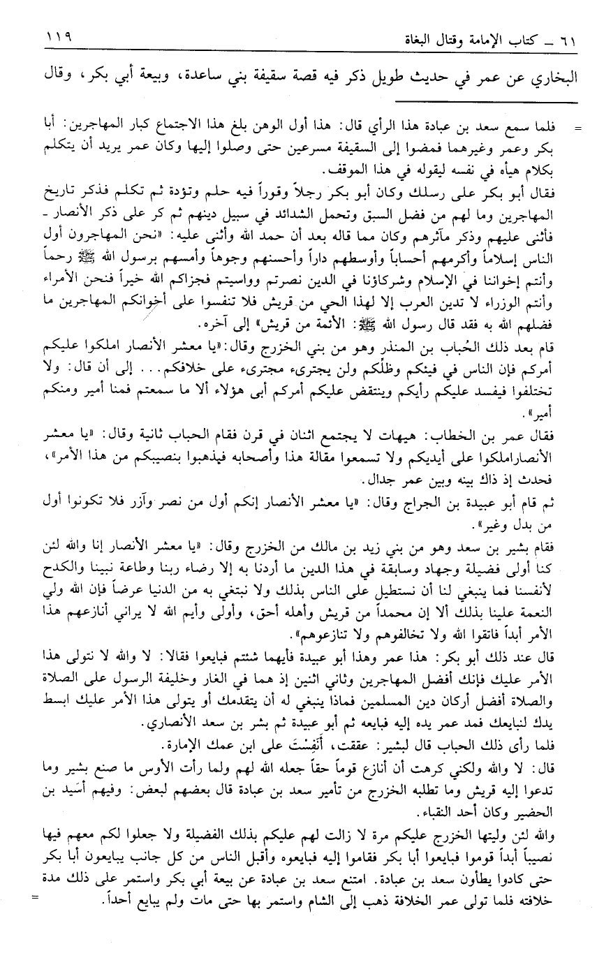 الْبُخَارِيُّ عَنْ عُمَرَ فِي حَدِيثٍ طَوِيلٍ ذَكَرَ فِيهِ قِصَّةَ سَقِيفَةِ بَنِي سَاعِدَةَ، وَبَيْعَةِ أَبِي بَكْرٍ، وَقَالَ