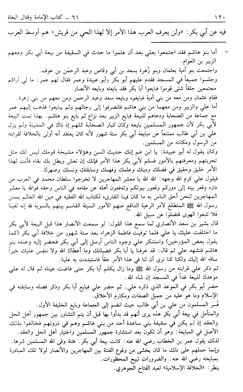 فِيهِ عَنْ أَبِي بَكْرٍ: "وَلَنْ يَعْرِفَ الْعَرَبُ هَذَا الْأَمْرَ إلَّا لِهَذَا الْحَيِّ مِنْ قُرَيْشٍ؛ هُمْ أَوْسَطُ الْعَرَبِ