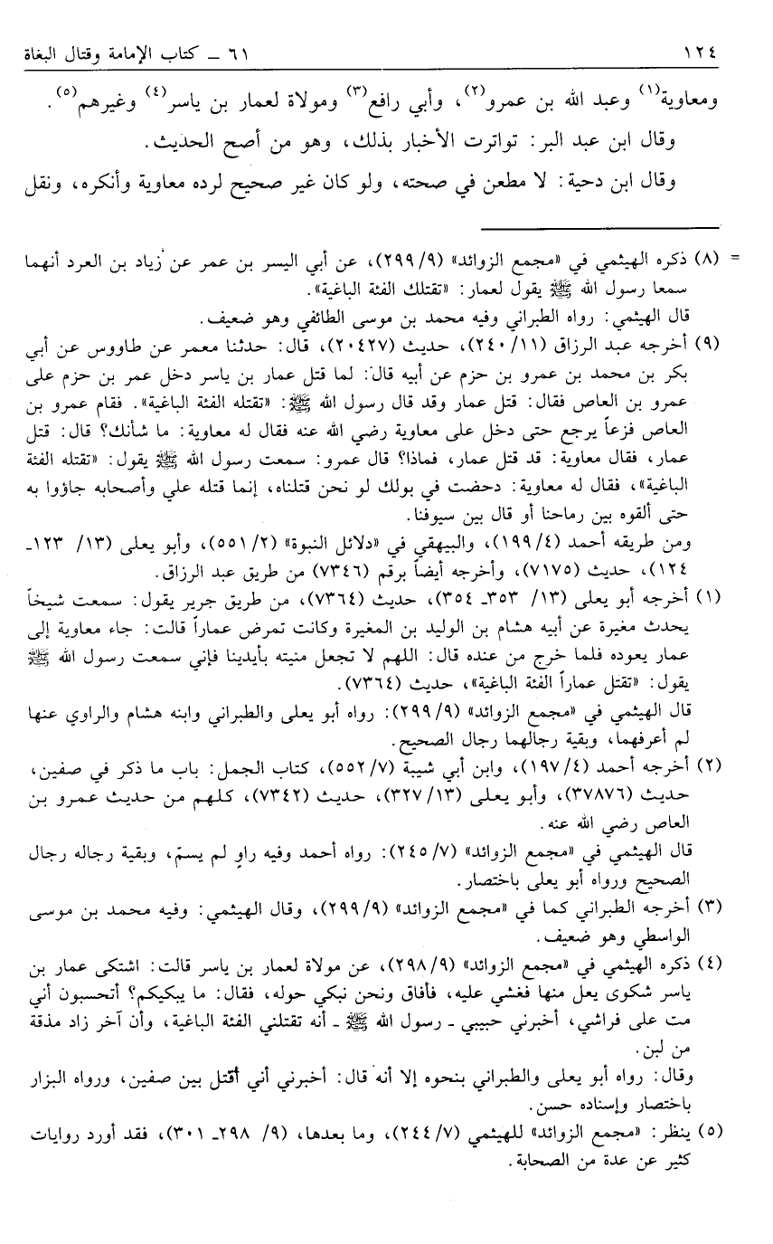 9 أخرجه عبد الرزاق [11/ 240] ، حديث [20427] ، قال: حدثنا معمر عن طاووس عن أبي بكر بن محمد بن عمرو بن حزم عن أبيه قال: لما قتل عمار بن ياسر دخل عمر بن حزم على عمرو بن العاص فقال: قتل عمار وقد قال رسول الله صَلَّى اللَّهُ عَلَيْهِ وَسَلَّمَ: "تقتله الفئة الباغية". فقام عمرو بن العاص فزعاً يرجع حتى دخل على معاوية رضي الله عنه فقال له معاوية: ما شأنك؟ قال: قتل عمار، فقال معاوية: قد قتل عمار، فماذا؟ قال عمرو: سمعت رسول الله صَلَّى اللَّهُ عَلَيْهِ وَسَلَّمَ يقول: "تقتله الفئة الباغية"، فقال له معاوية: دحضت في بولك لو نحن قتلناه، إنما قتله على وأصحابه جاؤواء به حتى ألقوه بين رماحنا أو قال بين سيوفنا.