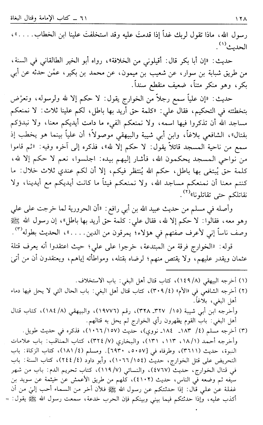 وَأَصْلُهُ فِي مُسْلِمٍ مِنْ حَدِيثِ عُبَيْدِ اللَّهِ بْنِ أَبِي رَافِعٍ: "أَنَّ الْحَرُورِيَّةَ لَمَّا خَرَجَتْ على عَلِيٍّ وَهُوَ مَعَهُ، فَقَالُوا: لَا حُكْمَ إلَّا لِلَّهِ، فَقَالَ عَلِيٌّ: كَلِمَةُ حَقٍّ أُرِيدَ بِهَا بَاطِلٌ"، إنَّ رَسُولَ اللَّهِ صَلَّى اللَّهُ عَلَيْهِ وَسَلَّمَ وَصَفَ نَاسًا إنِّي لَأَعْرِفُ صِفَتَهُمْ فِي هَؤُلَاءِ؛ يَمْرُقُونَ مِنْ الدِّينِ ... "، الْحَدِيثُ بِطُولِهِ3.