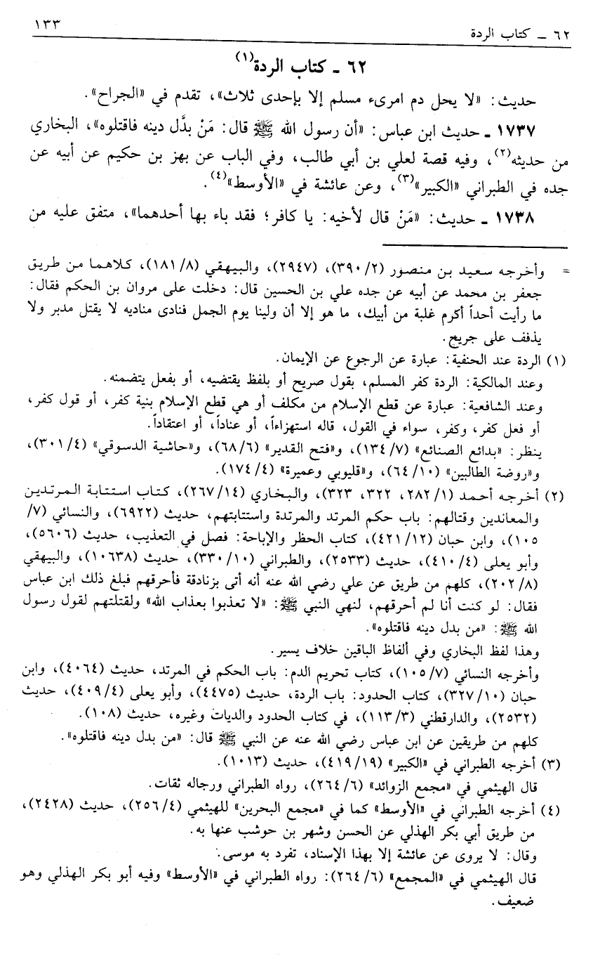 1737- حَدِيثُ ابْنِ عَبَّاسٍ: "أَنَّ رَسُولَ اللَّهِ صَلَّى اللَّهُ عَلَيْهِ وَسَلَّمَ قَالَ "مَنْ بَدَّلَ دِينَهُ فَاقْتُلُوهُ"، الْبُخَارِيُّ مِنْ حَدِيثِهِ2، وَفِيهِ قِصَّةٌ لِعَلِيِّ بْنِ أَبِي طَالِبٍ، وَفِي الْبَابِ عَنْ بَهْزِ بْنِ حَكِيمٍ عَنْ أَبِيهِ عَنْ جَدِّهِ فِي الطَّبَرَانِيِّ "الْكَبِيرِ"3، وَعَنْ عَائِشَةَ فِي "الْأَوْسَطِ"4.