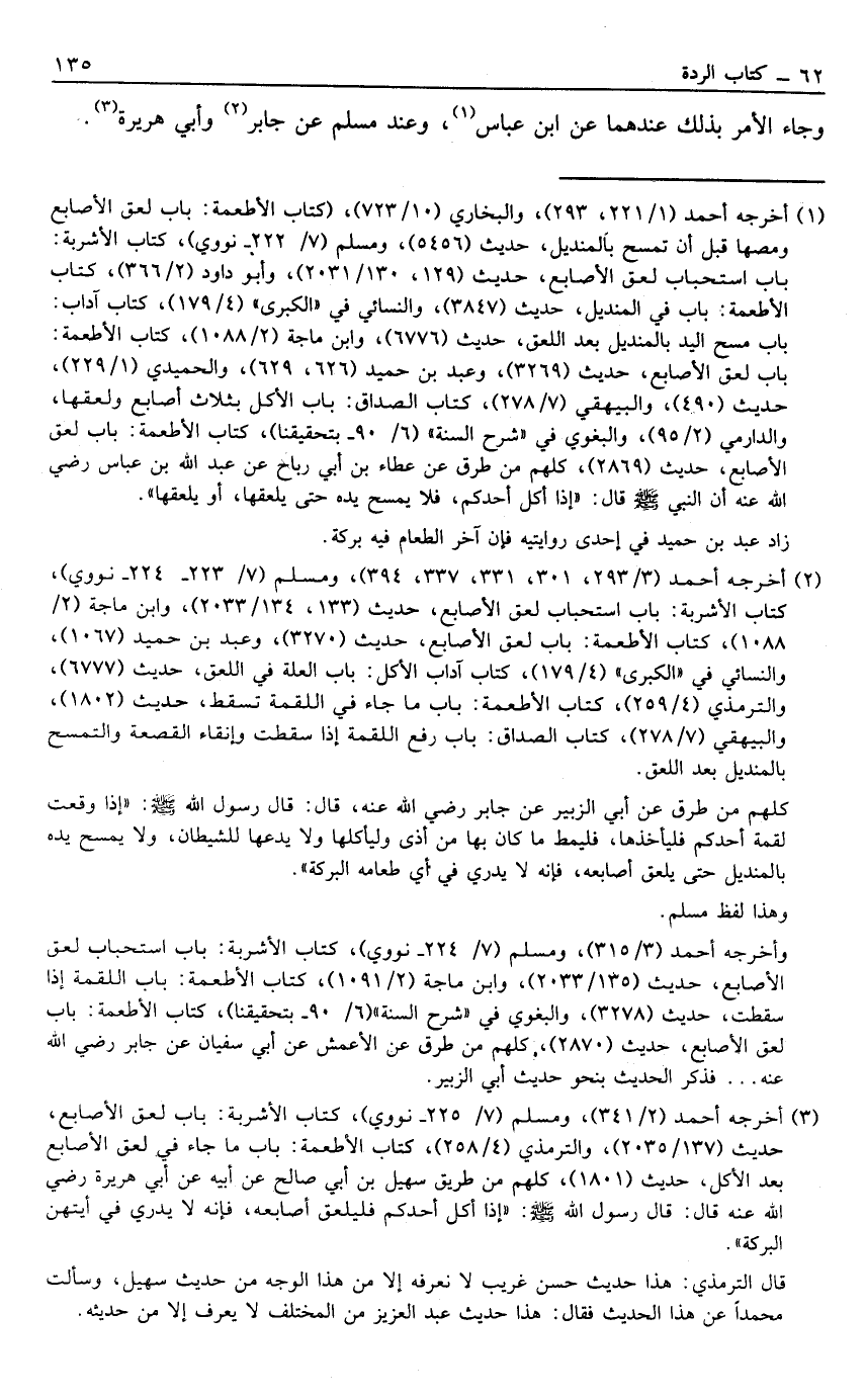 1 أخرجه أحمد [1/ 221، 293] ، والبخاري [10/ 723] ، [كتاب الأطعمة: باب لعق الأصابع ومصها قبل أن تمسح بالمنديل، حديث [5456] ، ومسلم [7/ 222- نووي] ، كتاب الأشربة: باب استحباب لعق الأصابع، حديث [129، 130/ 2031] ، وأبو داود [2/ 366] ، كتاب الأطعمة: باب في المنديل، حديث [3847] ، والنسائي في "الكبرى" [4/ 179] ، كتاب آداب: باب مسح اليد بالمنديل بعد اللعق، حديث [6776] ، وابن ماجة [2/ 1088] ، كتاب الأطعمة: باب لعق الأصابع، حديث [3269] ، وعبد بن حميد [626، 629] ، والحميدي [1/ 229] ، حديث [490] ، والبيهقي [7/ 278] ، كتاب الصداق: باب الأكل بثلاث أصابع ولعقها، والدارمي [2/ 95] ، والبغوي في "شرح السنة" [6/ 90- بتحقيقنا] ، كتاب الأطعمة: باب لعق الأصابع، حديث [2869] ، كلهم من طرق عن عطاء بن أبي رباح عن عبد الله بن عباس رضي الله عنه أن النبي صَلَّى اللَّهُ عَلَيْهِ وَسَلَّمَ قال: "إذا أكل أحدكم، فلا يمسح يده حتى يلعقها، أو يلعقها".
