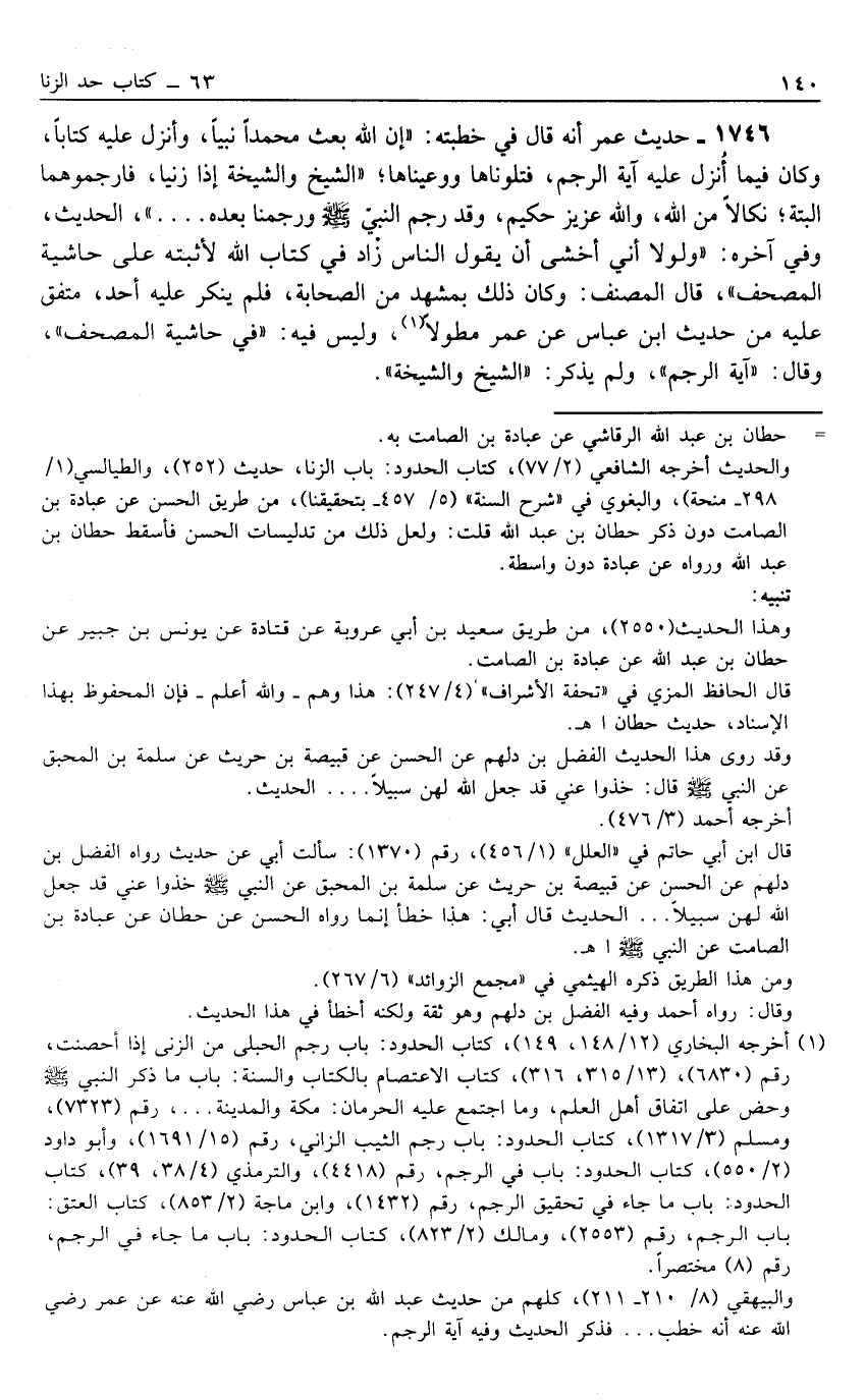 1746- حَدِيثُ عُمَرَ أَنَّهُ قَالَ فِي خُطْبَتِهِ: "إنَّ اللَّهَ بَعَثَ مُحَمَّدًا نَبِيًّا، وَأَنْزَلَ عَلَيْهِ كِتَابًا، وَكَانَ فِيمَا أُنْزِلَ عَلَيْهِ آيَةُ الرَّجْمِ، فَتَلَوْنَاهَا وَوَعَيْنَاهَا؛ "الشَّيْخُ وَالشَّيْخَةُ إذَا زَنَيَا، فَارْجُمُوهُمَا أَلْبَتَّةَ؛ نَكَالًا مِنْ اللَّهِ، وَاَللَّهُ عَزِيزٌ حَكِيمٌ، وَقَدْ رَجَمَ النَّبِيُّ صَلَّى اللَّهُ عَلَيْهِ وَسَلَّمَ وَرَجَمْنَا بَعْدَهُ ... "، الْحَدِيثَ، وَفِي آخره: "وَلَوْلَا أَنِّي أَخْشَى أَنْ يَقُولَ النَّاسُ زَادَ فِي كِتَابِ اللَّهِ لَأُثَبِّتُهُ عَلَى حَاشِيَةِ الْمُصْحَفِ"، قَالَ الْمُصَنِّفُ: وَكَانَ ذَلِكَ بِمَشْهَدٍ مِنْ الصَّحَابَةِ، فَلَمْ يُنْكِرْ عَلَيْهِ أَحَدٌ، مُتَّفَقٌ عَلَيْهِ مِنْ حَدِيثِ ابْنِ عَبَّاسٍ عَنْ عُمَرَ مُطَوَّلًا1، وَلَيْسَ فِيهِ: "فِي حَاشِيَةِ الْمُصْحَفِ"، وَقَالَ: "آيَةُ الرَّجْمِ"، وَلَمْ يَذْكُرْ: "الشَّيْخُ وَالشَّيْخَةُ".