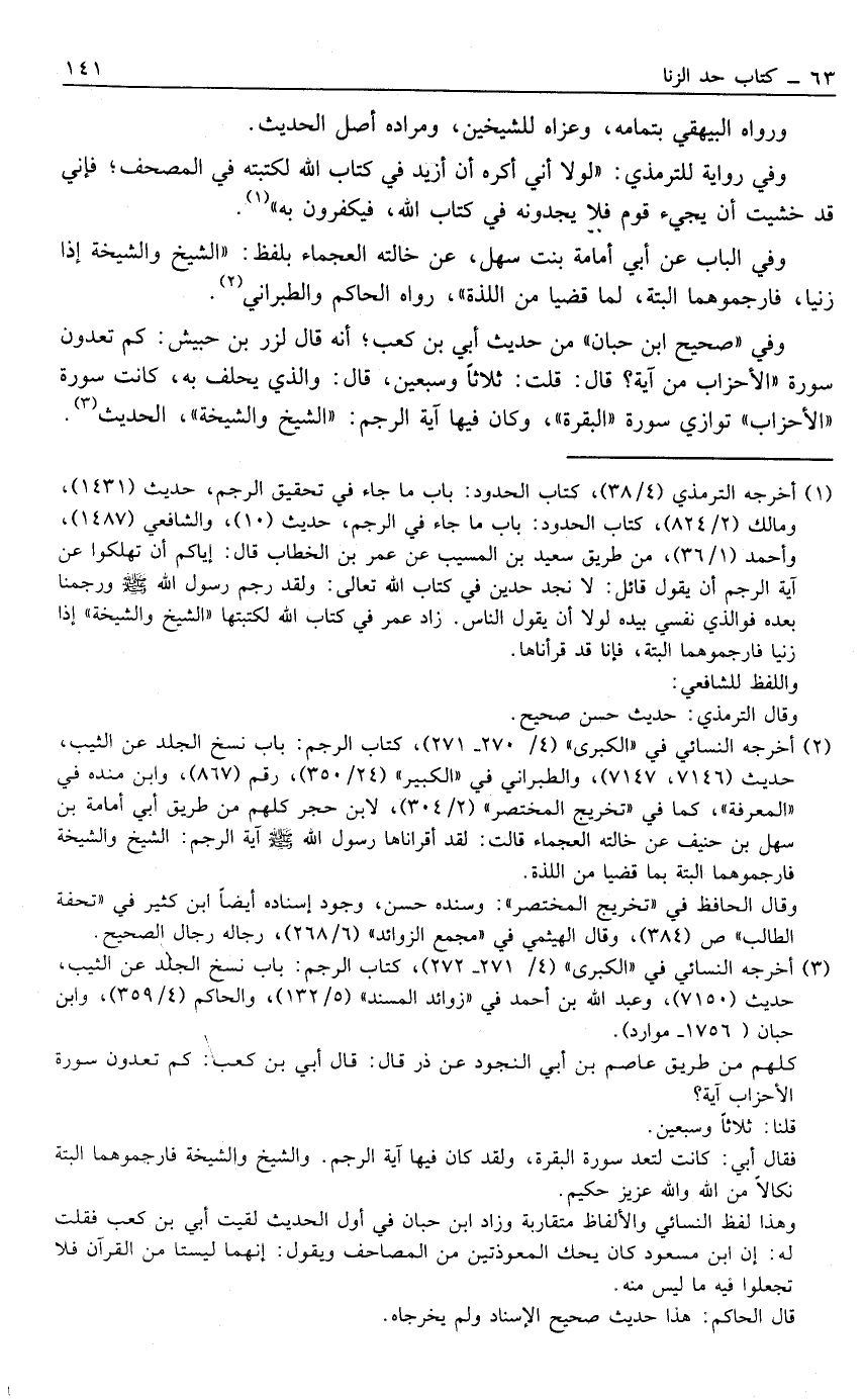 1 أخرجه الترمذي [4/ 38] ، كتاب الحدود: باب ما جاء في تحقيق الرجم، حديث [1431] ، ومالك [2/ 824] ، كتاب الحدود: باب ما جاء في الرجم، حديث [10] ، والشافعي [1487] ، وأحمد [1/ 36] ، من طريق سعيد بن المسيب عن عمر بن الخطاب قال: إياكم أن تهلكوا عن آية الرجم أن يقول قائل: لا نجد حدين في كتاب الله تعالى: ولقد رجم رسول الله صَلَّى اللَّهُ عَلَيْهِ وَسَلَّمَ ورجمنا بعنده فوالذي نفسي بيده لولا أن يقول الناس زاد عمر في كتاب الله لكتبتها "الشيخ والشيخة" إذا زنيا فارجموهما البتة، فإنا قد قرأناها.