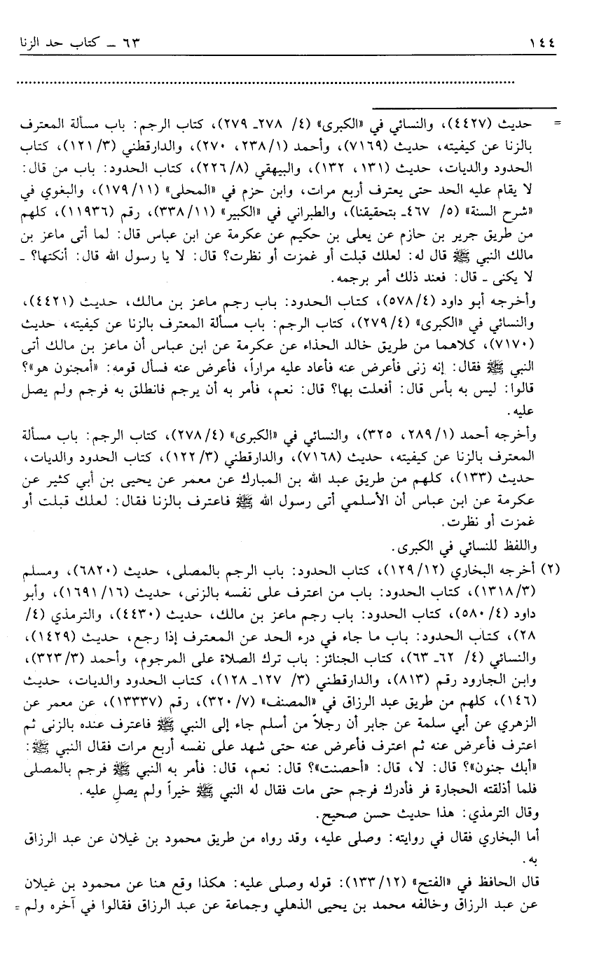 2 أخرجه البخاري [12/ 129] ، كتاب الحدود: باب الرجم بالمصلى، حديث [6820] ، ومسلم [3/ 1318] ، كتاب الحدود: باب من اعترف على نفسه بالزنى، حديث [16/ 1691] ، وأبو داود [4/ 580] ، كتاب الحدود: باب رجم ماعز بن مالك، حديث [4430] ، والترمذي [4/ 28] ، كتاب الحدود: باب ما جاء في درء الحد عن المعترف إذا رجع، حديث [1429] ، والنسائي [4/ 62- 63] ، كتاب الجنائز: باب ترك الصلاة على المرجوم، وأحمد [3/ 323] ، وابن الجارود رقم [813] ، والدارقطني [3/ 127- 128] ، كتاب الحدود والديات، حديث [146] ، كلهم من طريق عبد الرزاق في "المصنف" [7/ 320] ، رقم [13337] ، عن معمر عن الزهري عن أبي سلمة عن جابر أن رجلاً من أسلم جاء إلى النبي صلى الله عليه فاعترف عنده بالزنى ثم اعترف فأعرض عنه ثم اعترف فأعرض عنه حتى شهد على نفسه أربع مرات فقال النبي صَلَّى اللَّهُ عَلَيْهِ وَسَلَّمَ: "أبك جنون"؟ قال: لا، قال: "أحصنت"؟ قال: نعم، قال: فأمر به النبي صَلَّى اللَّهُ عَلَيْهِ وَسَلَّمَ فرجم بالمصلى فلما أذلقته الحجارة فر فأدرك فرجم حتى مات فقال له النبي صَلَّى اللَّهُ عَلَيْهِ وَسَلَّمَ خيراً ولم يصل عليه.