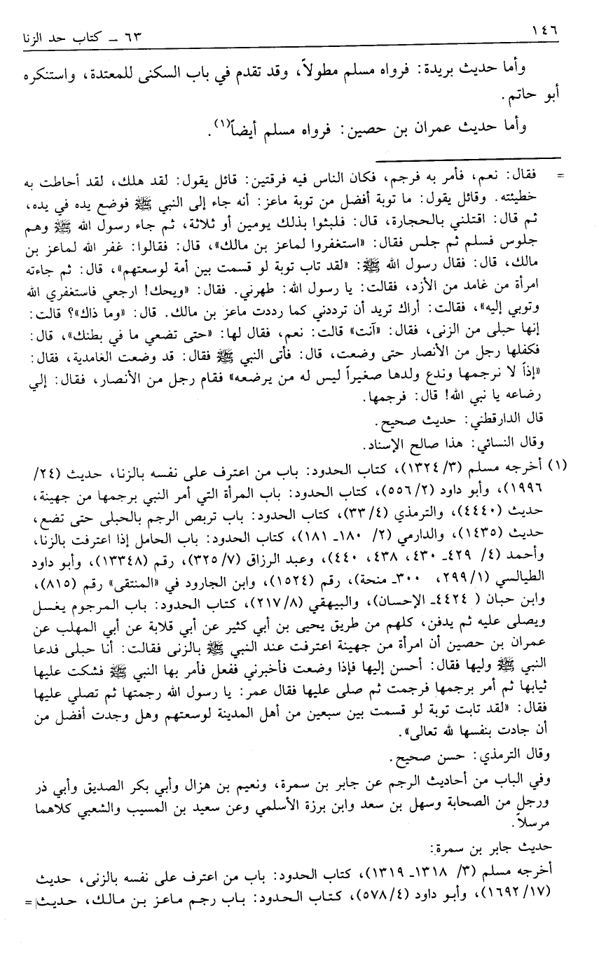 1 أخرجه مسلم [3/ 1324] ، كتاب الحدود: باب من اعترف على نفسه بالزنا، حديث [24/ 1996] ، وأبو داود [2/ 556] ، كتاب الحدود: باب المرأة التي أمر النبي برجمها من جهينة، حديث [4440] ، والترمذي [4/ 33] ، كتاب الحدود: باب تربص الرجم بالحبلى حتى تضع، حديث [1435] ، والدارمي [2/ 180- 181] ، كتاب الحدود: باب الحامل إذا اعترفت بالزنا، وأحمد [4/ 429- 430، 438، 440] ، وعبد الرزاق [7/ 325] ، رقم [13348] ، وأبو داود الطيالسي [1/ 299، 300- منحة] ، رقم [1524] ، وابن الجارود في "المنتقى" رقم [815] ، وابن حبان [4424- الإحسان] ، والبيهقي [8/ 217] ، كتاب الحدود: باب المرجوم يغسل ويصلى عليه ثم يدفن، كلهم من طريق يحيى بن أبي كثير عن أبي قلابة عن أبي المهلب عن عمران بن حصين أن امرأة من جهينة اعترفت عند النبي صَلَّى اللَّهُ عَلَيْهِ وَسَلَّمَ بالزنا فقالت: أنا حبلى فدعا النبي صَلَّى اللَّهُ عَلَيْهِ وَسَلَّمَ وليها فقال: أحسن إليها فإذا وضعت فأخبرني ففعل فأمر بها النبي صَلَّى اللَّهُ عَلَيْهِ وَسَلَّمَ فشكت عليها ثيابها ثم أمر برجمها فرجمت ثم صلى عليها فقال عمر: يا رسول الله رجمتها ثم تصلي عليها فقال: "لقد تابت توبة لو قسمت بين سبعين من أهل المدينة لوسعتهم وهل وجدت أفضل من أن جادت بنفسها لله تعالى".