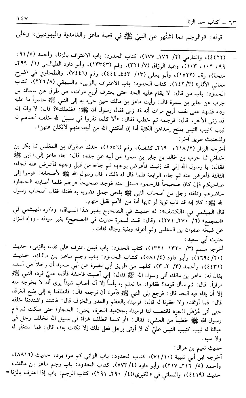 أخرجه مسلم [3/ 1320- 1321] ، كتاب الحدود: باب فيمن اعترف على نفسه بالزنى، حديث [20/ 1694] ، وأبو داود [4/ 581] ، كتاب الحدود: باب رجم ماعز بن مالك، حديث [4431] ، وأحمد [3/ 2- 3] ، كلهم من طريق أبي نضرة عن أبي سعيد أن رجلاً من أسلم يقال له: ماعز بن مالك أتى رسول الله صَلَّى اللَّهُ عَلَيْهِ وَسَلَّمَ فقال: إني اصبت فاحشة فأقمة على فرده النبي صَلَّى اللَّهُ عَلَيْهِ وَسَلَّمَ مراراً: قال: ثم سأل قومه؟ فقالوا: ما نعلم به بأساً إلا أنه أصاب شيئاً يرى أنه لا يخرجه منه إلا أن يقام فيه الحد قال: فرجع إلى الني صَلَّى اللَّهُ عَلَيْهِ وَسَلَّمَ فأمرنا أن نرجمه قال: فانطلقنا به إلى بقيع الغرقد قال: فما أوثقناه ولا حفرنا له قال: فرميناه بالعظم والمدر والخزف قال: فاشتد واشتددنا خلفه حتى أتى عرض الحرة فانتصب لنا فرميناه بجلاميد الحرة، يعني: الحجارة حتى سكت ثم قام رسول الله صَلَّى اللَّهُ عَلَيْهِ وَسَلَّمَ خطيباً من العشى، فقال: "أو كلما انطلقنا غزاة في سبيل الله تخلف رجل في عيالنا له نبيب كنبيب التيس علي أن لا أوتى برجل فعل ذلك إلا نكلت به"، قال: فما استغفر له ولا سبه.