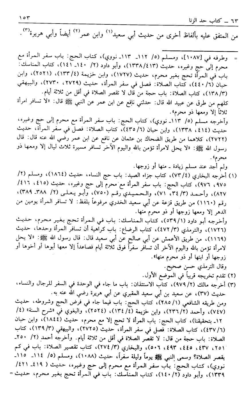 كلهم من طرق عن عبد الله قال: حدثني نافع عن ابن عمر عن النبي صَلَّى اللَّهُ عَلَيْهِ وَسَلَّمَ قال: "لا تسافر امرأة ثلاثاً إلا ومعها ذو محرم".