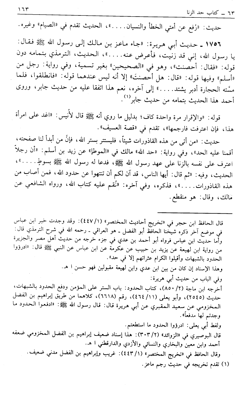 1756- حَدِيثُ أَبِي هُرَيْرَةَ: "جَاءَ مَاعِزُ بْنُ مَالِكٍ إلَى رَسُولِ اللَّهِ صَلَّى اللَّهُ عَلَيْهِ وَسَلَّمَ فَقَالَ: يَا رَسُولَ اللَّهِ، إنِّي قَدْ زَنَيْت، فَأَعْرَضَ عَنْهُ ... "، الْحَدِيثَ، التِّرْمِذِيُّ بِتَمَامِهِ دُونَ قَوْلِهِ: "فَقَالَ: أَحْصَنْت"، وَهُوَ فِي "الصَّحِيحَيْنِ" بِغَيْرِ تَسْمِيَةٍ، وَفِي رِوَايَةِ: رَجُلٍ مِنْ "أَسْلَمَ" وَفِيهَا قَوْلُهُ: "قَالَ: هَلْ أَحْصَنْت" إلَّا أَنَّهُ لَيْسَ عِنْدَهُمَا قَوْلُهُ: "فَانْطَلَقُوا، فَلَمَّا مَسَّتْهُ الْحِجَارَةُ أَدْبَرَ يَشْتَدُّ ... " إلَى آخِرِهِ، نَعَمْ هَذَا اتَّفَقَا عَلَيْهِ مِنْ حَدِيثِ جَابِرٍ، وَرَوَى أَحْمَدُ هَذَا الْحَدِيثَ بِتَمَامِهِ مِنْ حَدِيثِ جَابِرٍ1.