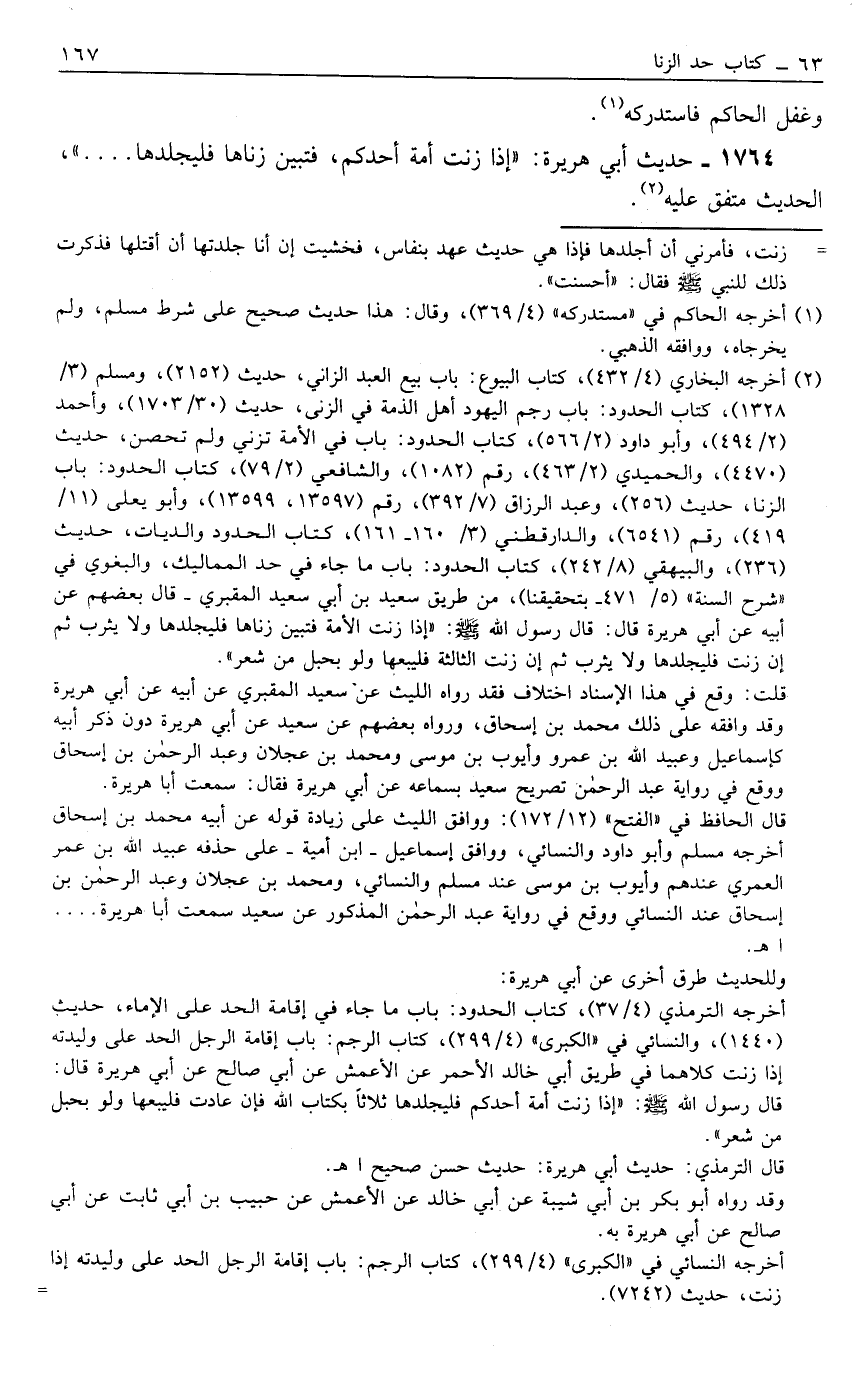 1764- حَدِيثُ: أَبِي هُرَيْرَةَ: "إذَا زَنَتْ أَمَةُ أَحَدِكُمْ، فَتَبَيَّنَ زِنَاهَا فَلْيَجْلِدْهَا ... "، الْحَدِيثُ مُتَّفَقٌ عَلَيْهِ2.
