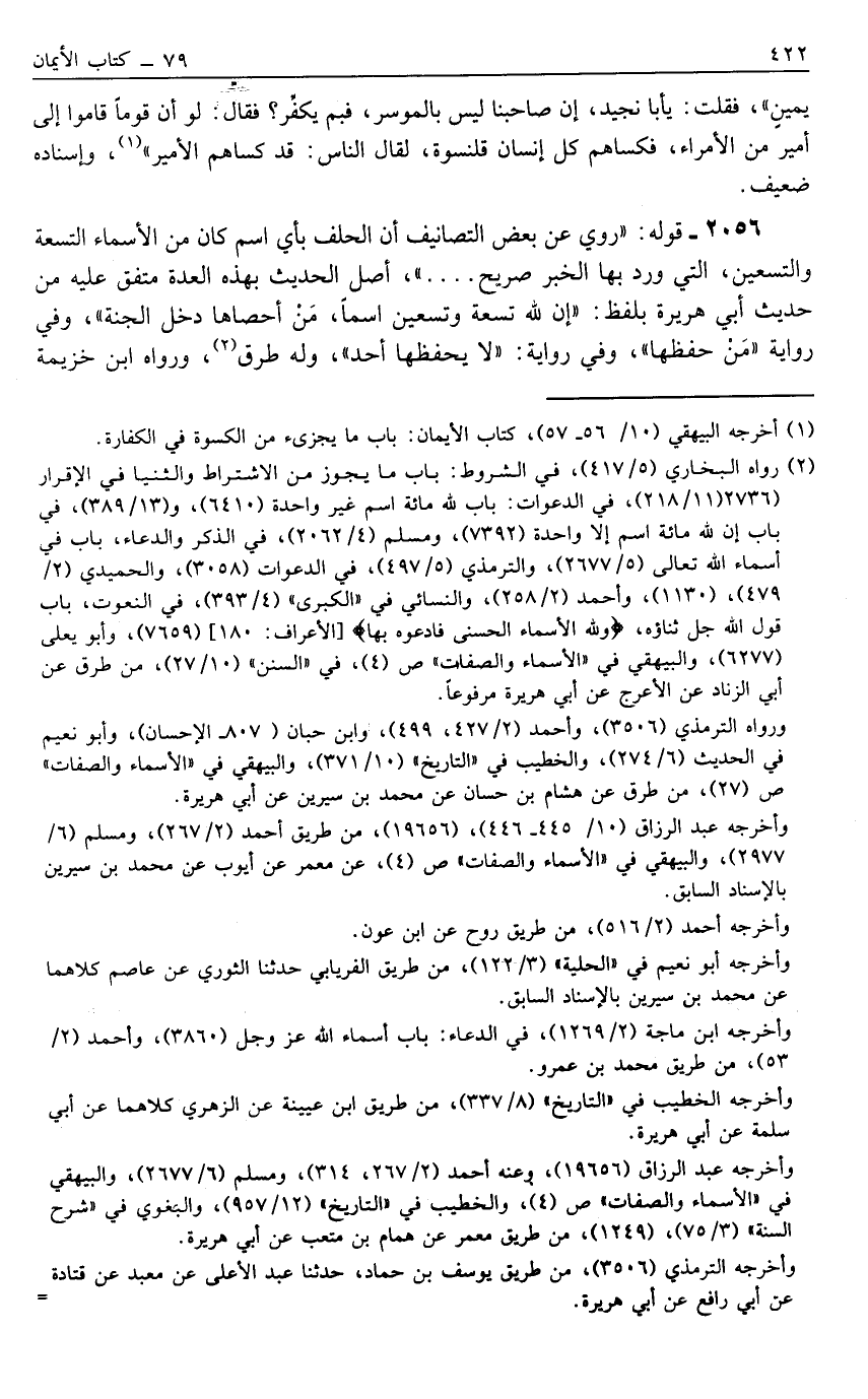 2056- قَوْلُهُ: "رُوِيَ عَنْ بَعْضِ التَّصَانِيفِ أَنَّ الْحَلِفَ بِأَيِّ اسْمٍ كَانَ مِنْ الْأَسْمَاءِ التِّسْعَةِ وَالتِّسْعِينَ, الَّتِي وَرَدَ بِهَا الْخَبَرُ صَرِيحٌ....", أَصْلُ الْحَدِيثِ بِهَذِهِ الْعِدَّةِ مُتَّفَقٌ عَلَيْهِ مِنْ حَدِيثِ أَبِي هُرَيْرَةَ بِلَفْظِ: "إنَّ لِلَّهِ تِسْعَةً وَتِسْعِينَ اسْمًا, مَنْ أَحْصَاهَا دَخَلَ الْجَنَّةَ" وَفِي رِوَايَةٍ "مَنْ حَفِظَهَا" , وَفِي رِوَايَةٍ: "لَا يَحْفَظُهَا أَحَدٌ" , وَلَهُ طُرُقٌ2, وَرَوَاهُ ابْنُ خُزَيْمَةَ