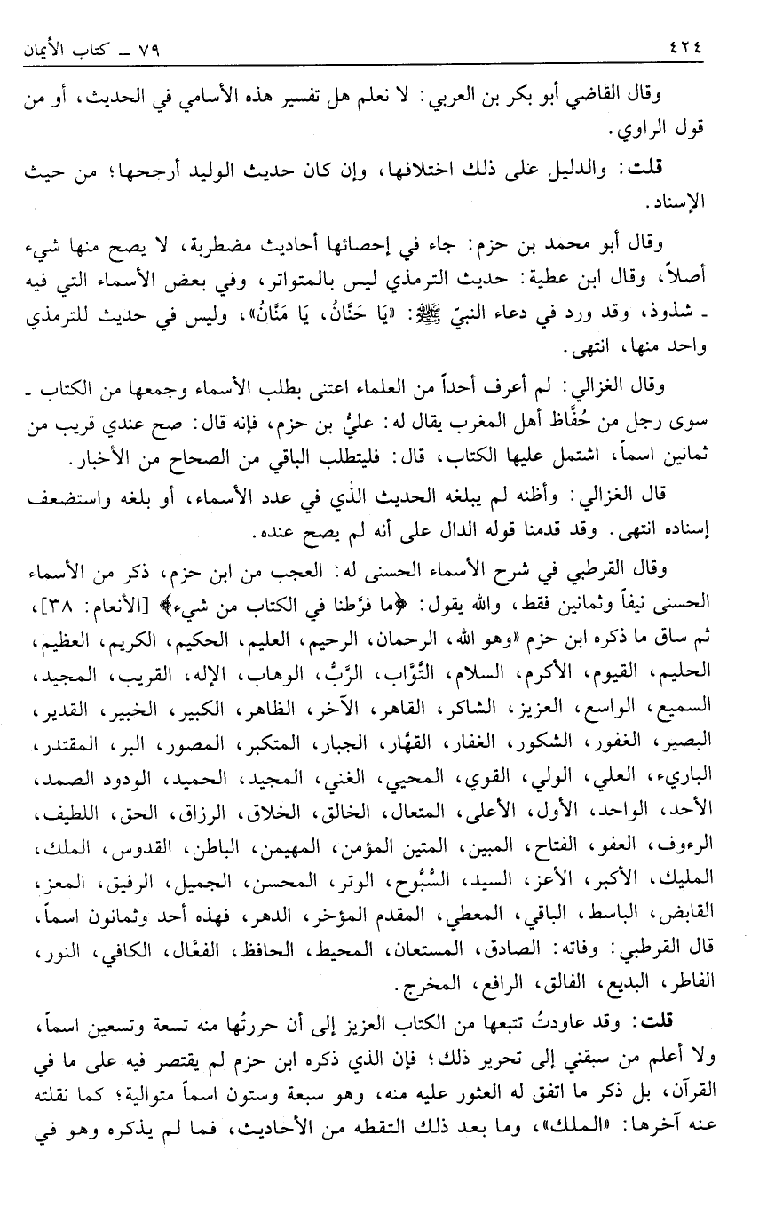 وَقَالَ الْقُرْطُبِيُّ فِي شَرْحِ الْأَسْمَاءِ الْحُسْنَى لَهُ: الْعَجَبُ مِنْ ابْنِ حَزْمٍ, ذَكَرَ مِنْ الْأَسْمَاءِ الْحُسْنَى نَيِّفًا وَثَمَانِينَ فَقَطْ, وَاَللَّهُ يَقُولُ: {مَا فَرَّطْنَا فِي الْكِتَابِ مِنْ شَيْءٍ} [الأنعام: 38] , ثُمَّ سَاقَ مَا ذَكَرَهُ ابْنُ حَزْمٍ "وَهُوَ اللَّهُ, الرَّحْمَنُ, الرَّحِيمُ, الْعَلِيمُ, الْحَكِيمُ, الْكَرِيمُ, الْعَظِيمُ, الْحَلِيمُ, الْقَيُّومُ, الْأَكْرَمُ, السَّلَامُ, التَّوَّابُ, الرَّبُّ, الْوَهَّابُ, الْإِلَهُ, الْقَرِيبُ, الْمُجِيبُ, السَّمِيعُ, الْوَاسِعُ, الْعَزِيزُ, الشَّاكِرُ, الْقَاهِرُ, الْآخِرُ, الظَّاهِرُ, الْكَبِيرُ, الْخَبِيرُ, الْقَدِيرُ, الْبَصِيرُ, الْغَفُورُ, الشَّكُورُ, الْغَفَّارُ, الْقَهَّارُ, الْجَبَّارُ, الْمُتَكَبِّرُ, الْمُصَوِّرُ, الْبَرُّ, الْمُقْتَدِرُ, الْبَارِئُ, الْعَلِيُّ, الْوَلِيُّ, الْقَوِيُّ, الْمُحَيِّي, الْغَنِيُّ, الْمَجِيدُ, الْحَمِيدُ, الْوَدُودُ, الصَّمَدُ, الْأَحَدُ, الْوَاحِدُ, الْأَوَّلُ, الْأَعْلَى, الْمُتَعَالُ, الْخَالِقُ, الْخَلَّاقُ, الرَّزَّاقُ, الْحَقُّ, اللَّطِيفُ, الرَّءُوفُ, الْعَفُوُّ, الْفَتَّاحُ, الْمُبِينُ, الْمَتِينُ, الْمُؤْمِنُ, الْمُهَيْمِنُ, الْبَاطِنُ, الْقُدُّوسُ, الْمَلِكُ, الْمَلِيكُ, الْأَكْبَرُ, الْأَعَزُّ, السَّيِّدُ, السُّبُّوحُ, الْوِتْرُ, الْمُحْسِنُ, الْجَمِيلُ, الرَّفِيقُ, الْمُعِزُّ, الْقَابِضُ, الْبَاسِطُ, الْبَاقِي, الْمُعْطِي, الْمُقَدِّمُ, الْمُؤَخِّرُ، الدَّهْرُ، فَهَذِهِ، أَحَدٌ، وَثَمَانُونَ، اسْمًا، قَالَ، الْقُرْطُبِيُّ، وَفَاتَهُ، الصَّادِقُ، الْمُسْتَعَانُ، الْمُحِيطُ، الْحَافِظُ، الْفَعَّالُ، الْكَافِي، النُّورُ, الْفَاطِرُ، الْبَدِيعُ، الْفَالِقُ، الرَّافِعُ، الْمُخْرِجُ.
