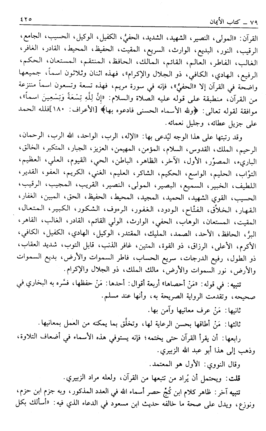 الْقُرْآنِ: "الْمَوْلَى, النَّصِيرُ, الشَّهِيدُ، الشَّدِيدُ، الْحَفِيُّ، الْكَفِيلُ، الْوَكِيلُ، الْحَسِيبُ، الْجَامِعُ، الرَّقِيبُ، النُّورُ، الْبَدِيعُ، الْوَارِثُ، السَّرِيعُ، الْمُقِيتُ، الْحَفِيظُ, الْمُحِيطُ، الْقَادِرُ، الْغَافِرُ، الْغَالِبُ، الْفَاطِرُ، الْعَالِمُ، الْقَائِمُ، الْمَالِكُ، الْحَافِظُ، الْمُنْتَقِمُ، الْمُسْتَعَانُ، الْحَكَمُ، الرَّفِيعُ، الْهَادِي، الْكَافِي، ذُو الْجَلَالِ وَالْإِكْرَامِ", فَهَذِهِ اثْنَانِ وَثَلَاثُونَ اسْمًا, جَمِيعُهَا وَاضِحَةٌ فِي الْقُرْآنِ إلَّا "الْحَفِيُّ", فَإِنَّهُ فِي سُورَةِ مَرْيَمَ, فَهَذِهِ تِسْعَةٌ وَتِسْعُونَ اسْمًا مُنْتَزِعَةً مِنْ الْقُرْآنِ, مُنْطَبِقَةً عَلَى قَوْلِهِ عَلَيْهِ الصَّلَاةُ وَالسَّلَامُ: "إنَّ لِلَّهِ تِسْعَةً وَتِسْعِينَ اسْمًا" , مُوَافِقَةً لِقَوْلِهِ تَعَالَى {وَلِلَّهِ الْأَسْمَاءُ الْحُسْنَى فَادْعُوهُ بِهَا} [الأعراف: 180] فَلِلَّهِ الْحَمْدُ عَلَى جَزِيلِ عَطَائِهِ, وَجَلِيلِ نَعْمَائِهِ.