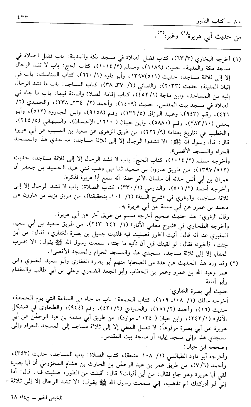 أخرجه ماللك [1/ 108- 109] , كتاب الجمعية: باب ماجاء في الساعة التي يوم الجمعة، حديث [16] , وأحمد [2/ 151] , والحمدي [2/ 421] , رقم [944] , والطحاوي في "مشكل الآثار" [1/ 242] , وابن حبان [1024- موارد] , من الطريق أبي سلمة بن عبد الرحمن عن أبي هريرة عن أبي بصرة مرفوعاً: "لا تعمل المطي إلا إلى ثلاثة مساجد الحرام وإلى مسجدي هذا وإلى مسجد إيلياء أو مسجد بيت المقدس".