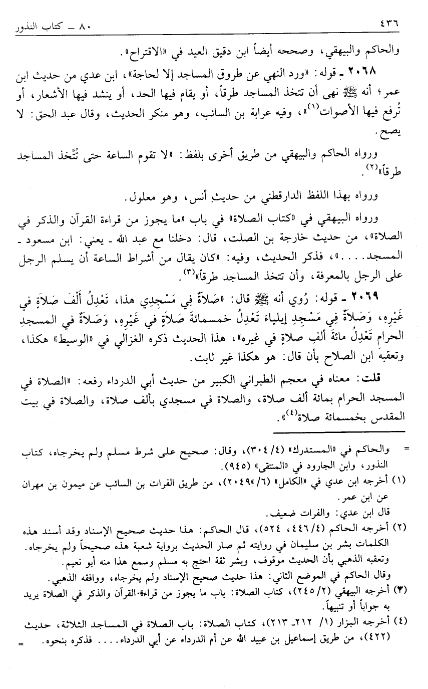 2068- قَوْلُهُ: "وَرَدَ النَّهْيُ عَنْ طُرُوقِ الْمَسَاجِدِ إلَّا لِحَاجَةٍ", ابْنُ عَدِيٍّ مِنْ حَدِيثِ ابْنِ عُمَرَ؛ "أَنَّهُ صَلَّى اللَّهُ عَلَيْهِ وَسَلَّمَ نَهَى أَنْ تُتَّخَذَ الْمَسَاجِدُ طُرُقًا, أَوْ يُقَامَ فِيهَا الْحَدُّ, أَوْ يُنْشَدَ فِيهَا الْأَشْعَارُ, أَوْ تُرْفَعَ فِيهَا الْأَصْوَاتُ1", وَفِيهِ عُرَابَةُ بْنُ السَّائِبِ, وَهُوَ مُنْكَرُ الْحَدِيثِ, وَقَالَ عَبْدُ الْحَقِّ: لَا يَصِحُّ.