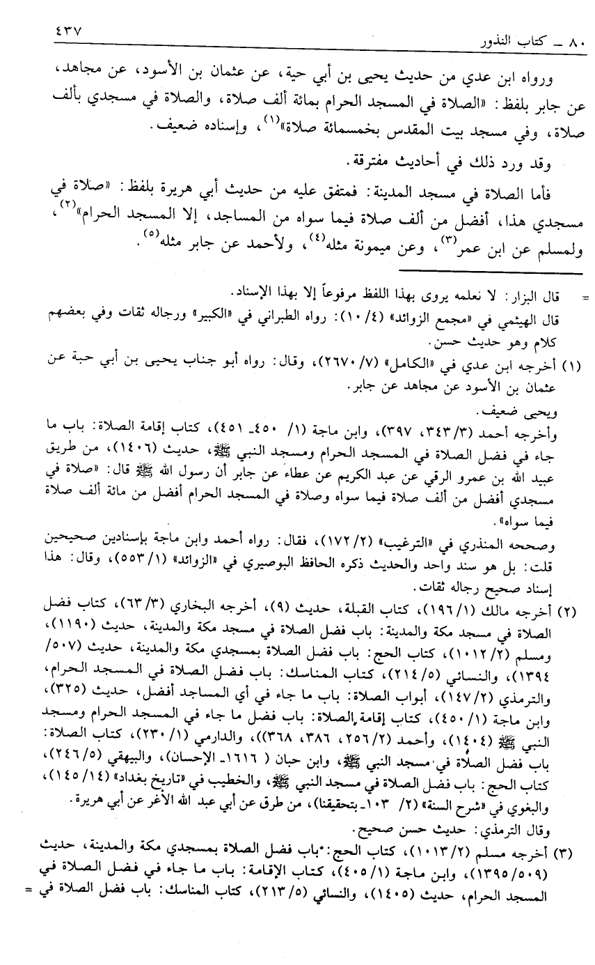 فَأَمَّا الصَّلَاةُ فِي مَسْجِدِ الْمَدِينَةِ: فَمُتَّفَقٌ عَلَيْهِ مِنْ حَدِيثِ أَبِي هُرَيْرَةَ بِلَفْظِ: "صَلَاةٌ فِي مَسْجِدِي هَذَا, أَفْضَلُ مِنْ أَلْفِ صَلَاةٍ فِيمَا سِوَاهُ مِنْ الْمَسَاجِدِ, إلَّا الْمَسْجِدُ الْحَرَامُ" 2, وَلِمُسْلِمٍ عَنْ ابْنِ عمر3, وعَنْ مَيْمُونَةَ مِثْلُهُ4, وَلِأَحْمَدَ عنجابر مِثْلُهُ5.