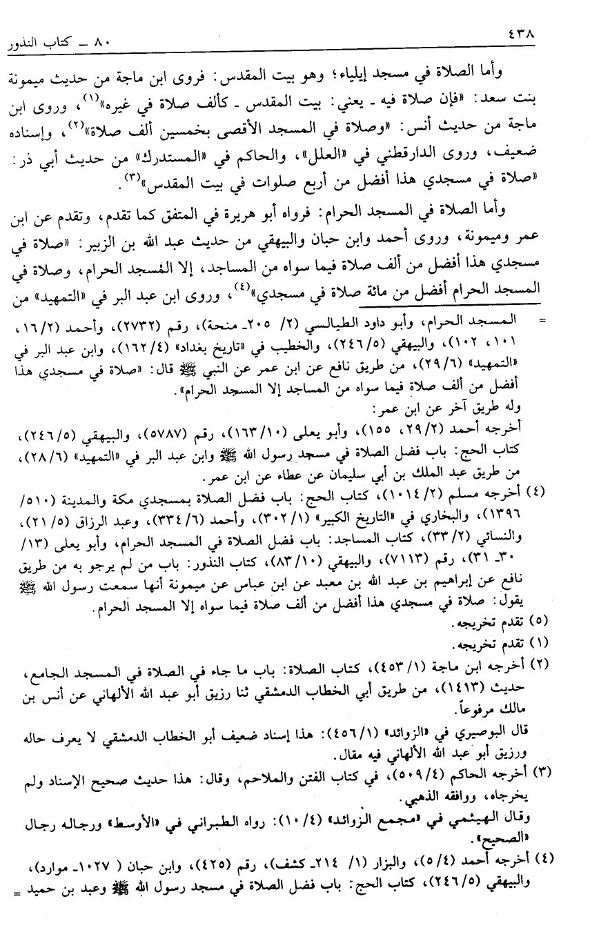 = المسجد الحرام، وأبو داود الطيالسي [2/ 205- منحة] , رقم [2732] , وأحمد [2/ 16, 101. 102] , والبيهقي [5/ 246] , والخطيب في "تاريخ بغداد" [4/ 162] , وابن عبد البر في "التمهيد" [6/ 29] , من طريق نافع عن ابن عمر عن النبي صَلَّى اللَّهُ عَلَيْهِ وَسَلَّمَ قال: "صلاة في مسجدي هذا أفضل من ألف صلاة فيما سواه من المساجد إلا المسجد الحرام" ,