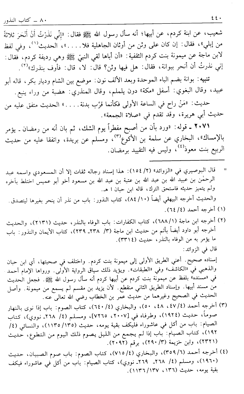 شُعَيْبٍ، عَنْ ابْنَةِ كردم، عَنْ أَبِيهَا؛ أَنَّهُ سَأَلَ رَسُولَ اللَّهِ صَلَّى اللَّهُ عَلَيْهِ وَسَلَّمَ فَقَالَ: "إنِّي نَذَرْت أَنْ أَنْحَرَ ثَلَاثَةً مِنْ إبِلِي"، فَقَالَ: "إنْ كَانَ عَلَى وَثَنٍ مِنْ أَوْثَانِ الْجَاهِلِيَّةِ فَلَا ... "، الْحَدِيثُ1، وَفِي لَفْظٍ لِابْنِ مَاجَهْ عن ميمونة بنت كردم الثَّقَفِيَّةِ: "أَنَّ أَبَاهَا لَقِيَ النبي صَلَّى اللَّهُ عَلَيْهِ وَسَلَّمَ وهي ريفة كردم، فَقَالَ: "إنِّي نَذَرْت أَنْ أَنْحَرَ بِبُوَانَةَ، فَقَالَ: "هَلْ فِيهَا وَثَنٌ"؟ قَالَ: لَا، قَالَ: "فَأَوْفِ بِنَذْرِك" 2.
