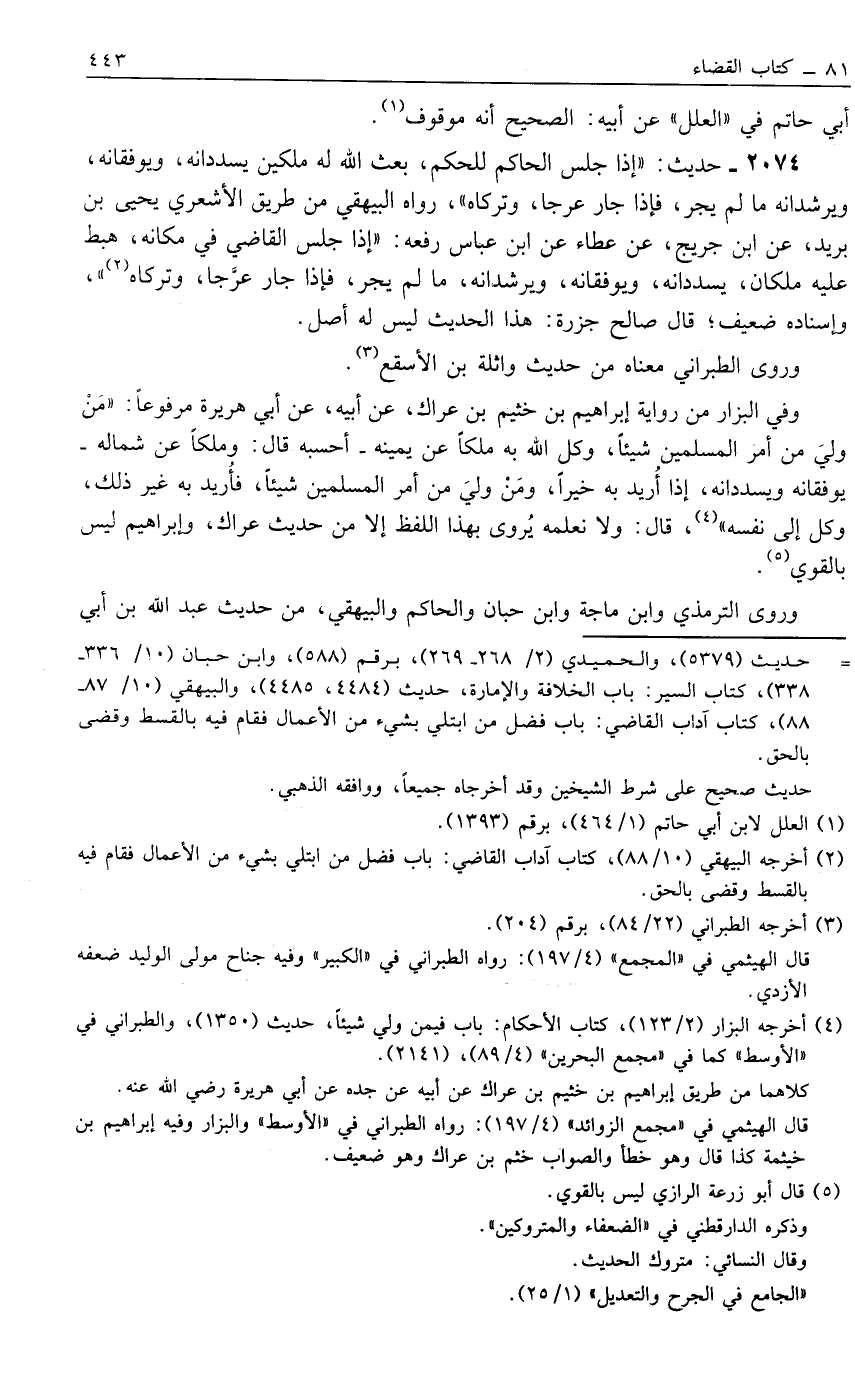 = حديث [5379] , والحميدي [2/ 268- 269] , برقم [588] , وابن حبان [10/ 366- 338] , كتاب السير: باب الخلافة والإمارة, حديث [4484, 4485] , والبيهقي [10/ 87- 88] , كتاب آداب القاضي: باب فضل من ابتلي بشيء من الأعمال فقام فيه بالقسط وقضى بالحق.