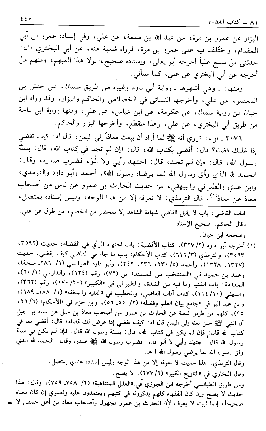 1 أخرجه أبو داود [2/ 327] , كتاب الأقضية: باب اجتهاد الرأي في القضاء، حديث [3592, 3593] , والترمذي [3/ 616] , كتاب الأحكام: باب ما جاء في القاضي كيف يقضي، حديث [1327, 1328] , وأحمد [5/ 230, 242] , وأبو داود الطيالسي [1/ 286- منحة] , وعبد بن حميد في "المنتخب من المسند" ص [72] , رقم [124] , والدارمي [1/ 60] , المقدمة: باب الفتيا وما فيه من الشدة، والطبراني في "الكبير" [20/ 170] , رقم [362] , والبيهقي [10/ 114] , كتاب آداب القاضي، والخطيب في "الفقه والمتفقة" [1/ 488- 189] , وابن عبد البر في "جامع بيان العلم وفضله" [2/ 55- 56] , وابن حزم في "الأحكام" [6/ 26, 35] , كلهم من طريق شعبة عن الحارث بن عمرو عن أصحاب معاذ بن جبل عن معاذ بن جبل أن النبي صَلَّى اللَّهُ عَلَيْهِ وَسَلَّمَ حين بعثه إلى اليمن قال له: "كيف تقضي إذا عرض لك قضاء؛ قال: أقضي بما في كتاب الله قال: فإن لم يكن في كتاب الله, قال: بسنة رسول الله قال: فإن لم يكن في سنة رسول الله قال: اجتهد رأيي لا آلو قال: فضرب رسول الله صَلَّى اللَّهُ عَلَيْهِ وَسَلَّمَ صدره وقال: الحمد لله الذي وفق رسول الله لما يرضى رسول الله" اهـ.