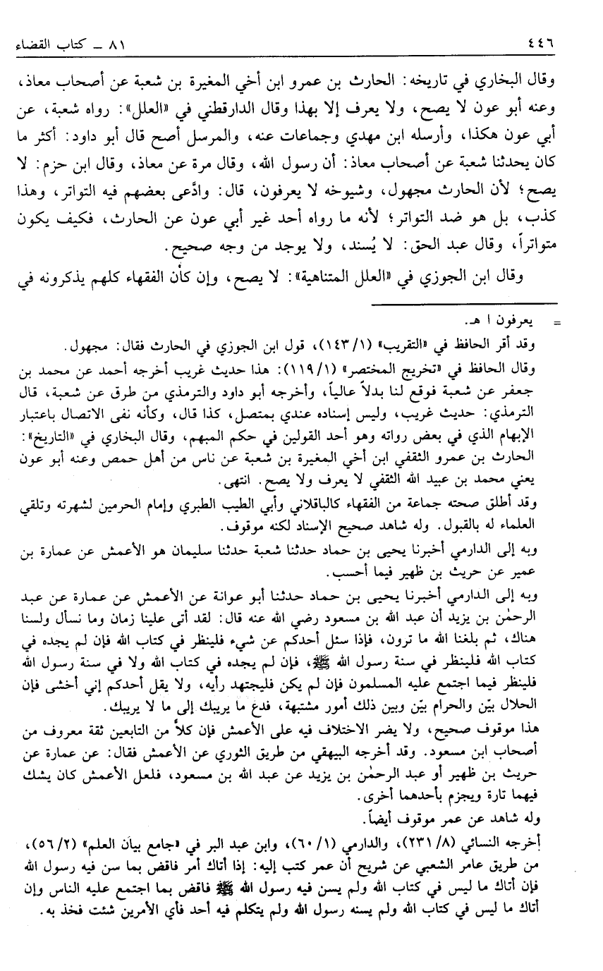 وَقَالَ الْبُخَارِيُّ فِي تَارِيخِهِ: الْحَارِثُ بْنُ عَمْرٍو عَنْ أَصْحَابِ مُعَاذٍ, وَعَنْهُ أَبُو عَوْنٍ لَا يَصِحُّ, وَلَا يُعْرَفُ إلَّا بِهَذَا وَقَالَ الدَّارَقُطْنِيُّ فِي "الْعِلَلِ": رَوَاهُ شُعْبَةُ, عَنْ أَبِي عَوْنٍ هَكَذَا, وَأَرْسَلَهُ ابْنُ مَهْدِيٍّ وَجَمَاعَاتٌ عَنْهُ, وَالْمُرْسَلُ أَصَحُّ قَالَ أَبُو دَاوُد: أَكْثَرُ مَا كان يحدثنا شبعة عَنْ أَصْحَابِ مُعَاذٍ: أَنَّ رسول ال, له وَقَالَ مَرَّةً عَنْ مُعَاذٍ, وَقَالَ ابْنُ حَزْمٍ: لَا يَصِحُّ؛ لِأَنَّ الْحَارِثَ مَجْهُولٌ, وَشُيُوخَهُ لَا يُعْرَفُونَ, قَالَ: وَادَّعَى بَعْضُهُمْ فِيهِ التَّوَاتُرَ, وَهَذَا كَذِبٌ, بَلْ هُوَ ضِدُّ التَّوَاتُرِ؛ لِأَنَّهُ مَا رَوَاهُ أَحَدٌ غَيْرُ أَبِي عَوْنٍ عَنْ الْحَارِثِ, فَكَيْفَ يَكُونُ مُتَوَاتِرًا, وَقَالَ عَبْدُ الْحَقِّ: لَا يُسْنَدُ, وَلَا يُوجَدُ مِنْ وَجْهٍ صَحِيحٍ