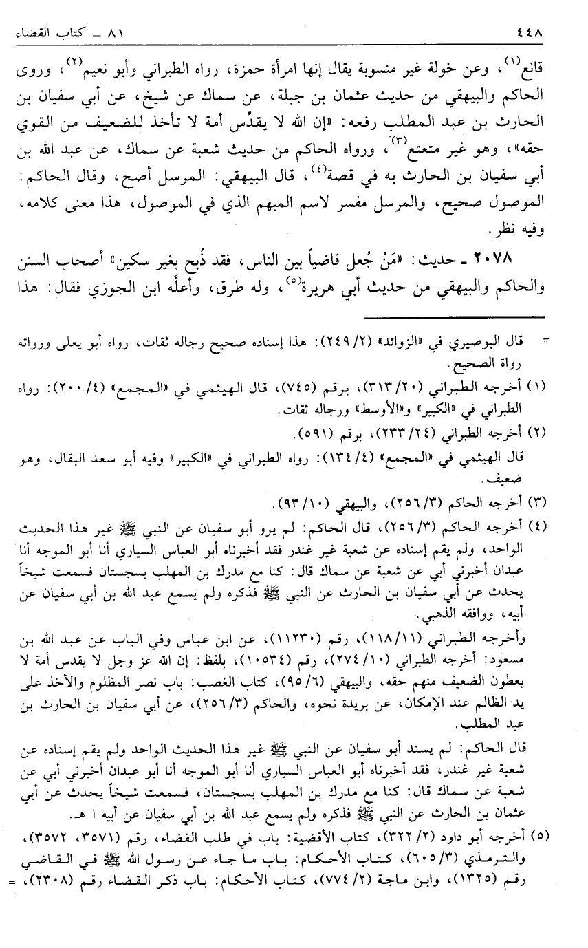 2078- حَدِيثُ: "مَنْ جُعِلَ قَاضِيًا بَيْنَ النَّاسِ, فَقَدْ ذُبِحَ بِغَيْرِ سِكِّينٍ" أَصْحَابُ السُّنَنِ وَالْحَاكِمُ وَالْبَيْهَقِيُّ مِنْ حَدِيثِ أَبِي هُرَيْرَةَ5, وَلَهُ طُرُقٌ, وَأَعَلَّهُ ابْنُ الْجَوْزِيِّ فَقَالَ: هَذَا