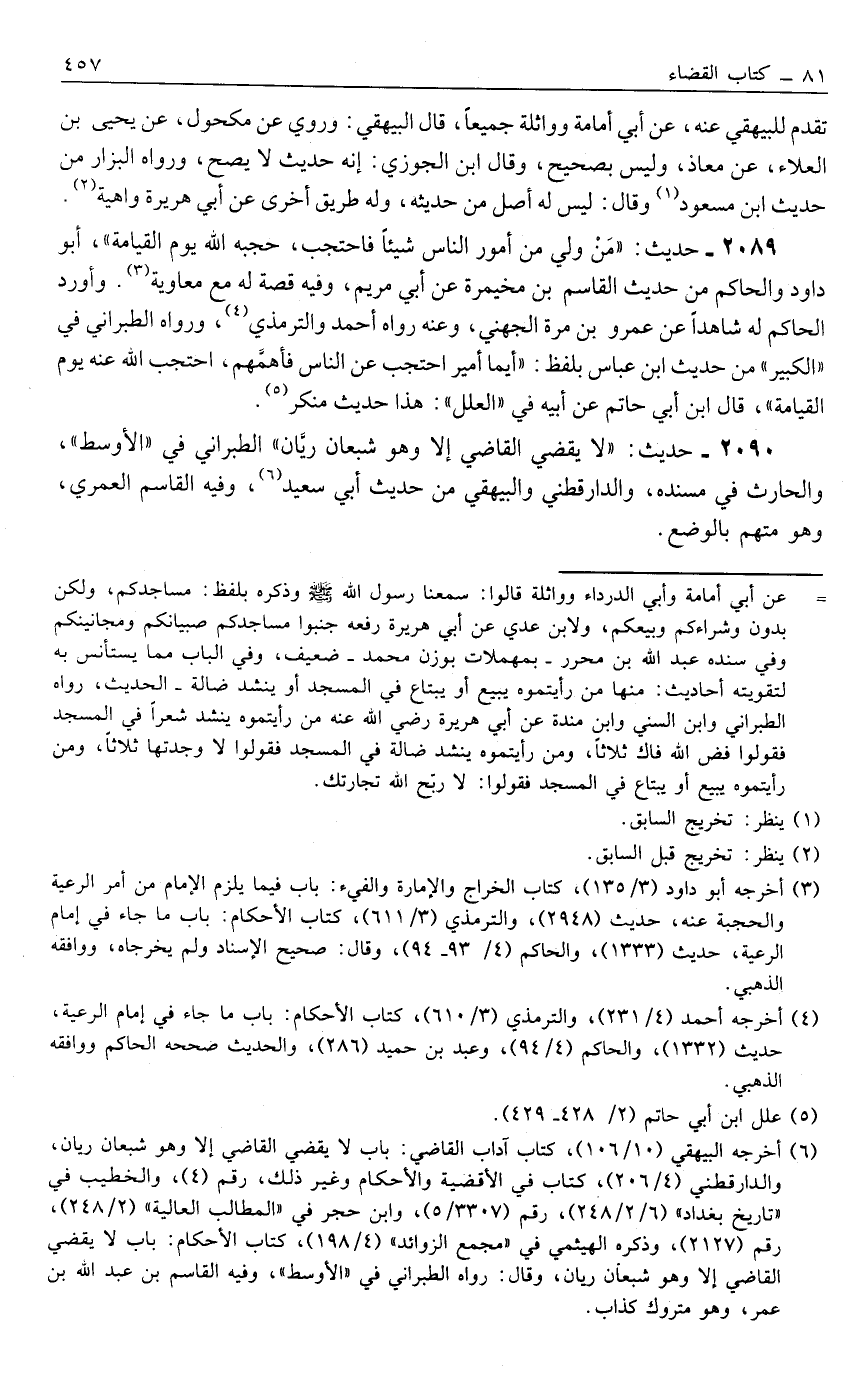 2090- حَدِيثُ: "لَا يَقْضِي الْقَاضِي إلَّا وَهُوَ شَبْعَانُ رَيَّانُ" الطَّبَرَانِيُّ فِي "الْأَوْسَطِ"، وَالْحَارِثُ فِي مُسْنَدِهِ، وَالدَّارَقُطْنِيّ وَالْبَيْهَقِيُّ مِنْ حَدِيثِ أَبِي سَعِيدٍ6، وَفِيهِ الْقَاسِمُ الْعُمَرِيُّ، وَهُوَ مُتَّهَمٌ بِالْوَضْعِ.