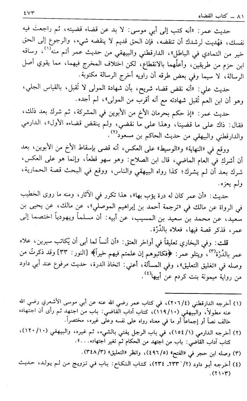 حَدِيثُ عُمَرَ: "أَنَّهُ كَتَبَ إلَى أَبِي مُوسَى: لا بد عن قَضَاءٌ قَضَيْتَهُ, ثُمَّ رَاجَعْت فِيهِ نَفْسَك, فَهُدِيت لِرُشْدِك أن تنقضه, فَإِنَّ الْحَقَّ قَدِيمٌ لَا يَنْقُضُهُ شَيْءٌ, وَالرُّجُوعُ إلَى الْحَقِّ خَيْرٌ مِنْ التَّمَادِي فِي الْبَاطِلِ", الدَّارَقُطْنِيُّ وَالْبَيْهَقِيُّ مِنْ حَدِيثِ عُمَرَ أَتَمَّ مِنْهُ1, وَسَاقَهُ ابْنُ حَزْمٍ مِنْ طَرِيقِينَ, وَأَعَلَّهُمَا بِالِانْقِطَاعِ, لَكِنَّ اخْتِلَافَ الْمَخْرَجِ فِيهِمَا, مِمَّا يُقَوِّي أَصْلَ الرِّسَالَةِ, لَا سِيَّمَا وَفِي بَعْضِ طُرُقِهِ أَنَّ رَاوِيَهُ أَخْرَجَ الرِّسَالَةَ مَكْتُوبَةً.