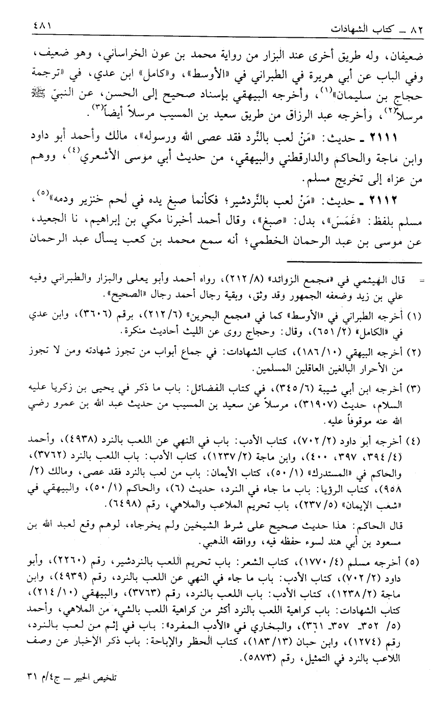 2112- حَدِيثُ: "مَنْ لَعِبَ بِالنَّرْدَشِيرِ؛ فَكَأَنَّمَا صَبَغَ يَدَهُ فِي لَحْمِ خِنْزِيرٍ ودمه" 5، مسلم بلفظ: "غمس"، بَدَلَ: "صَبَغَ"، وَقَالَ أَحْمَدُ أَخْبَرَنَا مَكِّيُّ بْنُ إبْرَاهِيمَ، نَا الْجُعَيْدُ، عَنْ مُوسَى بْنِ عَبْدِ الرَّحْمَنِ الْخِطْمِيِّ؛ أَنَّهُ سَمِعَ مُحَمَّدَ بْنَ كَعْبٍ يَسْأَلُ عَبْدَ الرَّحْمَنِ