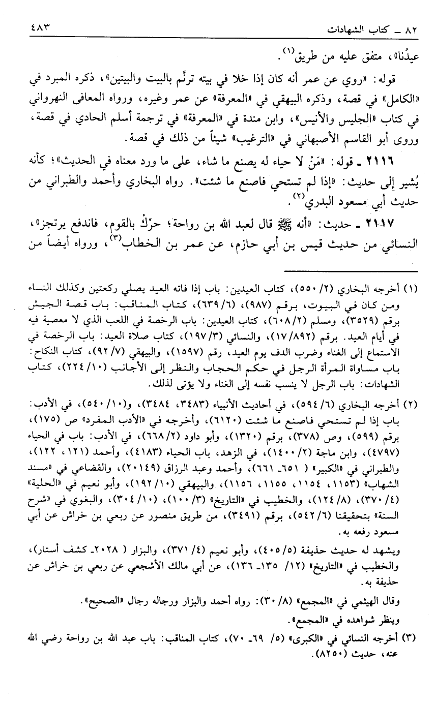 2116- قَوْلُهُ: "مَنْ لَا حَيَاءَ لَهُ يَصْنَعُ مَا شَاءَ، عَلَى مَا وَرَدَ مَعْنَاهُ فِي الْحَدِيثِ"؛ كَأَنَّهُ يُشِيرُ إلَى حَدِيثِ: "إذَا لم تستحيي فَاصْنَعْ مَا شِئْت"، رَوَاهُ الْبُخَارِيُّ وَأَحْمَدُ وَالطَّبَرَانِيُّ مِنْ حَدِيثِ أَبِي مَسْعُودٍ الْبَدْرِيِّ2.