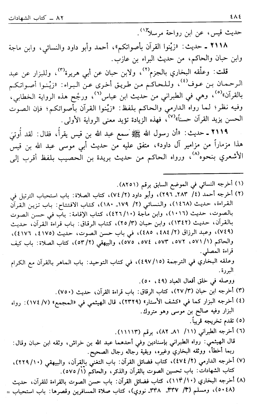 2118- حَدِيثُ: "زَيِّنُوا الْقُرْآنَ بِأَصْوَاتِكُمْ"، أَحْمَدُ وَأَبُو دَاوُد وَالنَّسَائِيُّ، وَابْنُ مَاجَهْ وَابْنُ حِبَّانَ وَالْحَاكِمُ، مِنْ حَدِيثِ الْبَرَاءِ بْنِ عَازِبٍ.