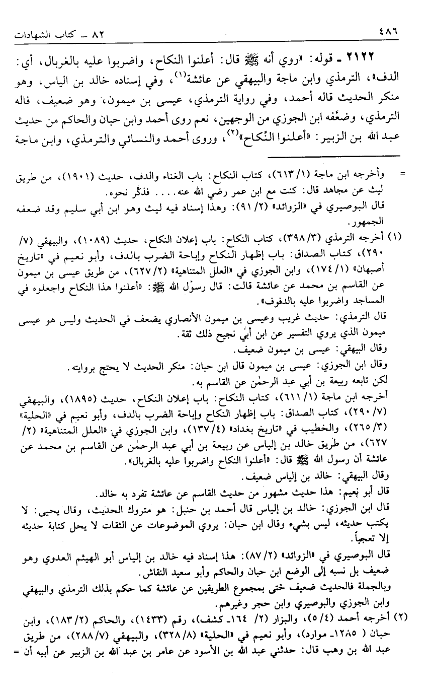 2122- قَوْلُهُ: "رُوِيَ أَنَّهُ صَلَّى اللَّهُ عَلَيْهِ وَسَلَّمَ قَالَ: "أَعْلِنُوا النِّكَاحَ، وَاضْرِبُوا عَلَيْهِ بِالْغِرْبَالِ، أَيْ: الدُّفِّ"، التِّرْمِذِيُّ وَابْنُ مَاجَهْ وَالْبَيْهَقِيُّ عَنْ عَائِشَةَ1، وَفِي إسْنَادِهِ خَالِدُ بْنُ إلْيَاسَ، وَهُوَ مُنْكَرُ الْحَدِيثِ قَالَهُ أَحْمَدُ، وَفِي رِوَايَةِ التِّرْمِذِيِّ، عِيسَى بن ميمون، وهو ضعف، قَالَهُ التِّرْمِذِيُّ، وَضَعَّفَهُ ابْنُ الْجَوْزِيِّ مِنْ الْوَجْهَيْنِ، نَعَمْ رَوَى أَحْمَدُ وَابْنُ حِبَّانَ وَالْحَاكِمُ مِنْ حَدِيثِ عَبْدِ اللَّهِ بْنِ الزُّبَيْرِ: "أَعْلِنُوا النِّكَاحَ" 2، وَرَوَى أَحْمَدُ وَالنَّسَائِيُّ وَالتِّرْمِذِيُّ، وَابْنُ مَاجَهْ