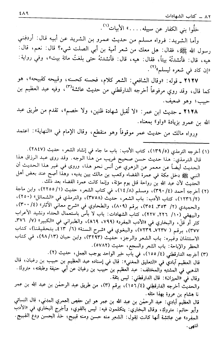 2127- قَوْلُهُ: "وَقَالَ الشَّافِعِيُّ الشِّعْرُ كَلَامٌ، فَحَسَنُهُ كَحَسَنِهِ، وَقَبِيحُهُ كَقَبِيحِهِ"، هُوَ كَمَا قَالَ، وَقَدْ رُوِيَ مَرْفُوعًا أَخْرَجَهُ الدَّارَقُطْنِيُّ مِنْ حَدِيثِ عَائِشَةَ3، وَفِيهِ عَبْدُ الْعَظِيمِ بْنُ حَبِيبٍ؛ وَهُوَ ضَعِيفٌ.