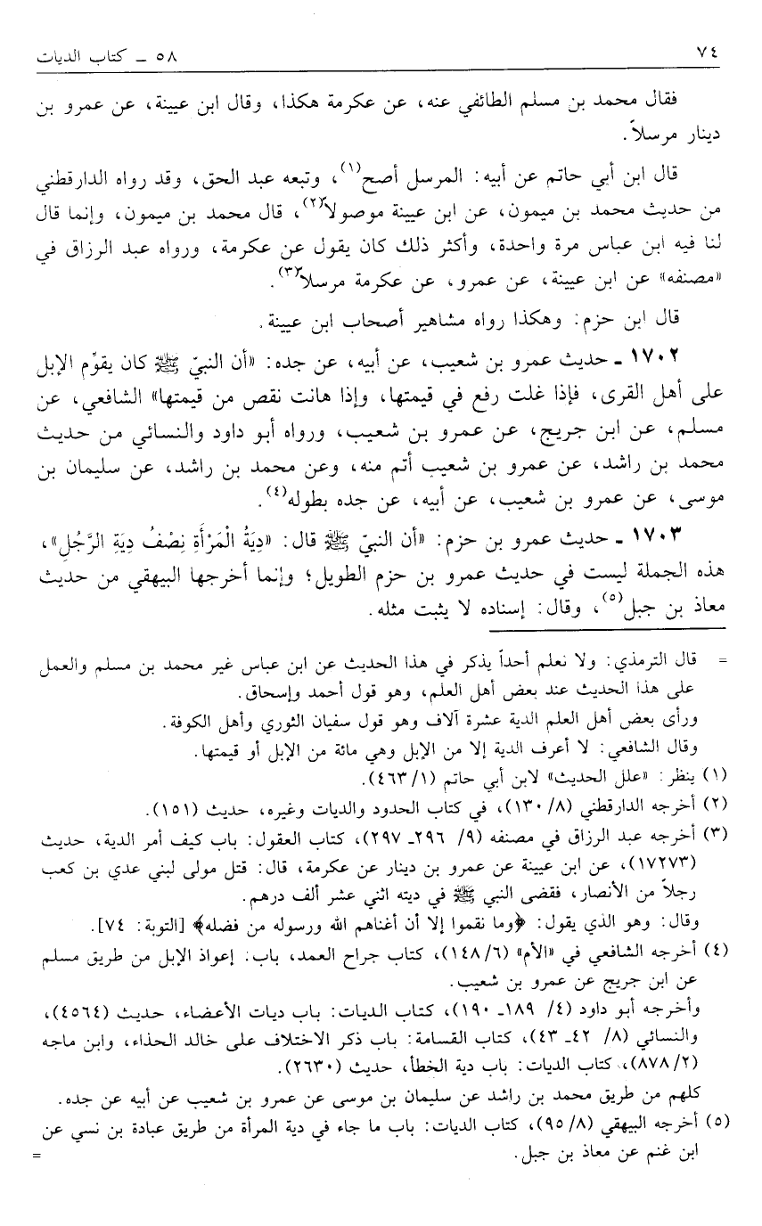 1703- حَدِيثُ عَمْرِو بْنِ حَزْمٍ: "أَنَّ النَّبِيَّ صَلَّى اللَّهُ عَلَيْهِ وَسَلَّمَ قَالَ: "دِيَةُ الْمَرْأَةِ نِصْفُ دِيَةِ الرَّجُلِ"، هَذِهِ الْجُمْلَةُ لَيْسَتْ فِي حَدِيثِ عَمْرِو بْنِ حَزْمٍ الطَّوِيلِ؛ وَإِنَّمَا أَخْرَجَهَا الْبَيْهَقِيُّ مِنْ حَدِيثِ مُعَاذِ بْنِ جَبَلٍ5، وَقَالَ: إسْنَادُهُ لَا يَثْبُتُ مِثْلُهُ.