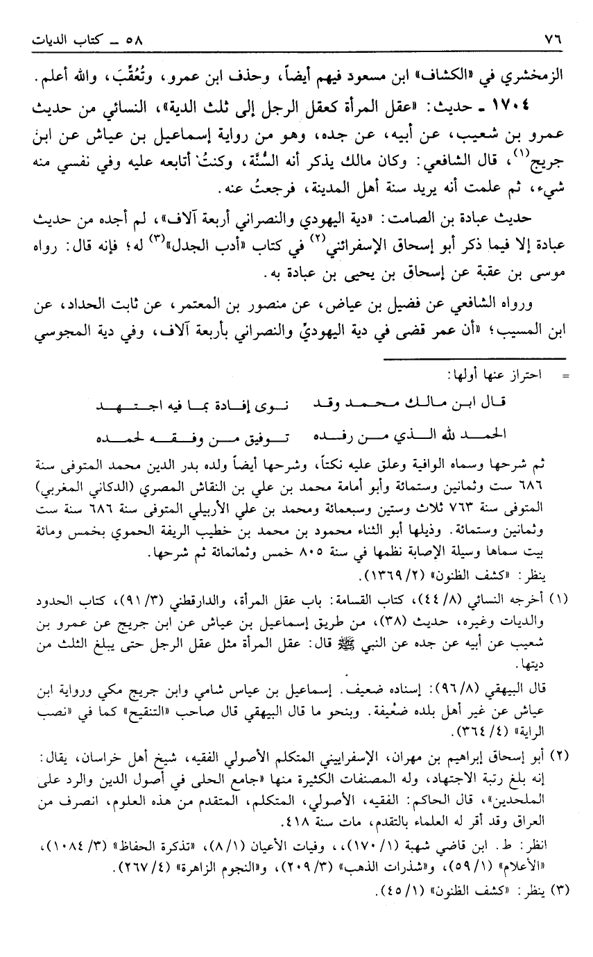 1704- حَدِيثُ: "عَقْلُ الْمَرْأَةِ كَعَقْلِ الرَّجُلِ إلَى ثُلُثِ الدِّيَةِ"، النَّسَائِيُّ مِنْ حَدِيثِ عَمْرِو بْنِ شُعَيْبٍ، عَنْ أَبِيهِ، عَنْ جَدِّهِ، وَهُوَ مِنْ رِوَايَةِ إسْمَاعِيلَ بْنِ عَيَّاشٍ عَنْ ابْنِ جُرَيْجٍ1، قَالَ الشَّافِعِيُّ: وَكَانَ مَالِكٌ يَذْكُرُ أَنَّهُ السُّنَّةُ، وَكُنْت أُتَابِعُهُ عَلَيْهِ وَفِي نَفْسِي مِنْهُ شَيْءٌ، ثُمَّ عَلِمْت أَنَّهُ يُرِيدُ سُنَّةَ أَهْلِ الْمَدِينَةِ، فَرَجَعْت عَنْهُ.
