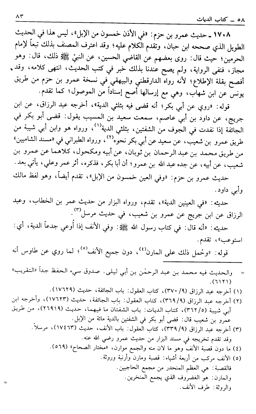 1708- حَدِيثُ عَمْرِو بْنِ حَزْمٍ: "فِي الْأُذُنِ خَمْسُونَ مِنْ الْإِبِلِ"، لَيْسَ هَذَا فِي الْحَدِيثِ الطَّوِيلِ الَّذِي صَحَّحَهُ ابْنُ حِبَّانَ، وَتَقَدَّمَ الْكَلَامُ عَلَيْهِ؛ وَقَدْ اعْتَرَفَ الْمُصَنِّفُ بِذَلِكَ تَبَعًا لِإِمَامِ الْحَرَمَيْنِ؛ حَيْثُ قَالَ: رَوَى بَعْضُهُمْ عَنْ الْقَاضِي الْحُسَيْنِ، عَنْ النَّبِيِّ صَلَّى اللَّهُ عَلَيْهِ وَسَلَّمَ ذَلِكَ، قَالَ: وَهُوَ مَجَازٌ، فَنَفَى الرِّوَايَةَ، وَلَمْ يَصِحَّ عِنْدَنَا بِذَلِكَ خَبَرٌ فِي كُتُبِ الْحَدِيثِ، انْتَهَى كَلَامُهُ، وَقَدْ أَفْصَحَ بِقِلَّةِ الِاطِّلَاعِ؛ لِأَنَّهُ رَوَاهُ الدَّارَقُطْنِيُّ وَالْبَيْهَقِيُّ فِي نُسْخَةِ عَمْرِو بْنِ حَزْمٍ مِنْ طَرِيقِ يُونُسَ عَنْ ابْنِ شِهَابٍ، وَهِيَ مَعَ إرْسَالِهَا أَصَحُّ إسْنَادًا مِنْ الْمَوْصُولِ؛ كَمَا تَقَدَّمَ.