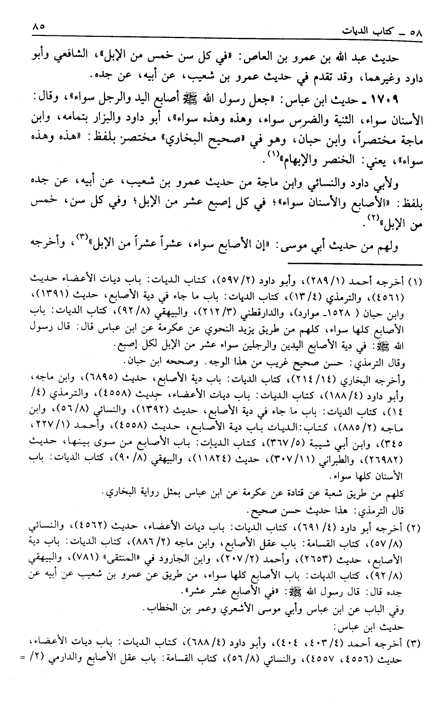 1709- حَدِيثُ ابْنِ عَبَّاسٍ: "جَعَلَ رَسُولُ اللَّهِ صَلَّى اللَّهُ عَلَيْهِ وَسَلَّمَ أَصَابِعَ الْيَدِ وَالرِّجْلِ سَوَاءً"، وَقَالَ: "الْأَسْنَانُ سَوَاءٌ، الثَّنِيَّةُ والضرس سواء، وهذه وَهَذِهِ سَوَاءٌ"، أَبُو دَاوُد وَالْبَزَّارُ بِتَمَامِهِ، وَابْنُ مَاجَهْ مُخْتَصَرًا، وَابْنُ حِبَّانَ، وَهُوَ في "صحيح البخاري" مختصر بِلَفْظِ: "هَذِهِ وَهَذِهِ سَوَاءٌ"، يَعْنِي: الْخِنْصِرَ وَالْإِبْهَامَ"1.
