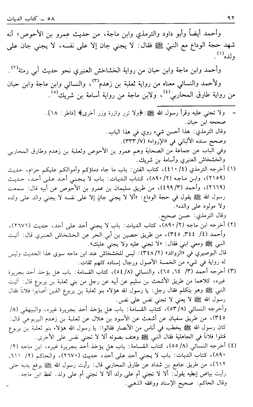 وَأَحْمَدُ أَيْضًا وَأَبُو دَاوُد وَالتِّرْمِذِيُّ وَابْنُ مَاجَهْ، مِنْ حَدِيثِ عَمْرِو بْنِ الْأَحْوَصِ؛ أَنَّهُ شَهِدَ حَجَّةَ الْوَدَاعِ مَعَ النَّبِيِّ صَلَّى اللَّهُ عَلَيْهِ وَسَلَّمَ فَقَالَ: لَا يَجْنِي جَانٍ إلَّا عَلَى نَفْسِهِ، لَا يَجْنِي جَانٍ عَلَى وَلَدِهِ1.