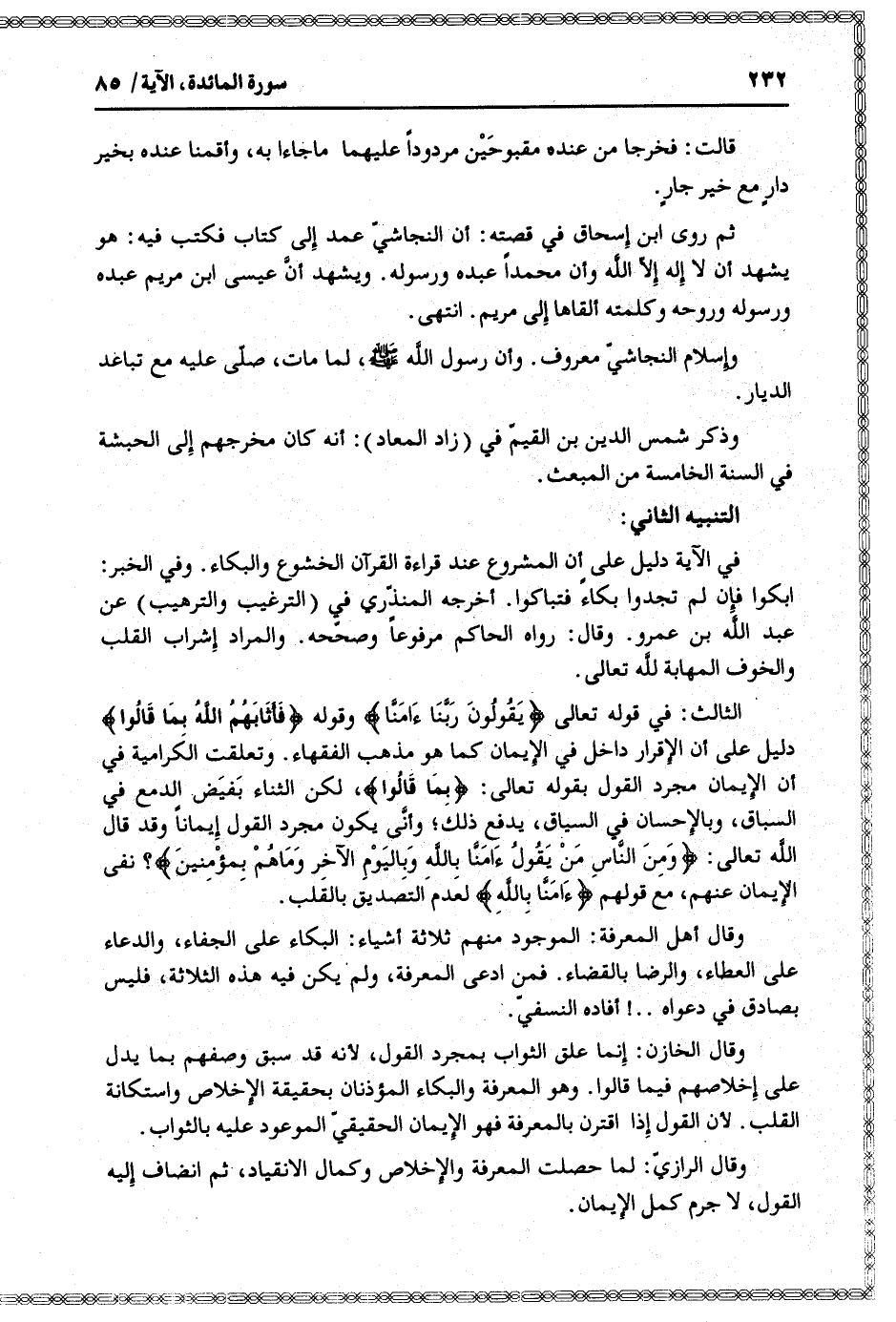الثالث: في قوله تعالى: يَقُولُونَ رَبَّنا آمَنَّا وقوله فَأَثابَهُمُ اللَّهُ بِما قالُوا دليل على أن الإقرار داخل في الإيمان كما هو مذهب الفقهاء. وتعلقت الكرامية في أن الإيمان مجرد القول بقوله تعالى: بِما قالُوا، لكن الثناء بفيض الدمع في السباق، وبالإحسان في السياق، يدفع ذلك وأنّى يكون مجرد القول إيمانا وقد قال الله تعالى: وَمِنَ النَّاسِ مَنْ يَقُولُ آمَنَّا بِاللَّهِ وَبِالْيَوْمِ الْآخِرِ وَما هُمْ بِمُؤْمِنِينَ؟ نفى الإيمان عنهم، مع قولهم آمَنَّا بِاللَّهِ لعدم التصديق بالقلب.
