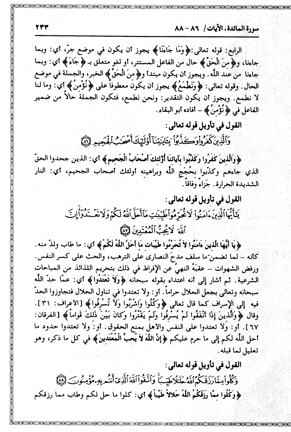 يا أَيُّهَا الَّذِينَ آمَنُوا لا تُحَرِّمُوا طَيِّباتِ ما أَحَلَّ اللَّهُ لَكُمْ وَلا تَعْتَدُوا إِنَّ اللَّهَ لا يُحِبُّ الْمُعْتَدِينَ (87)